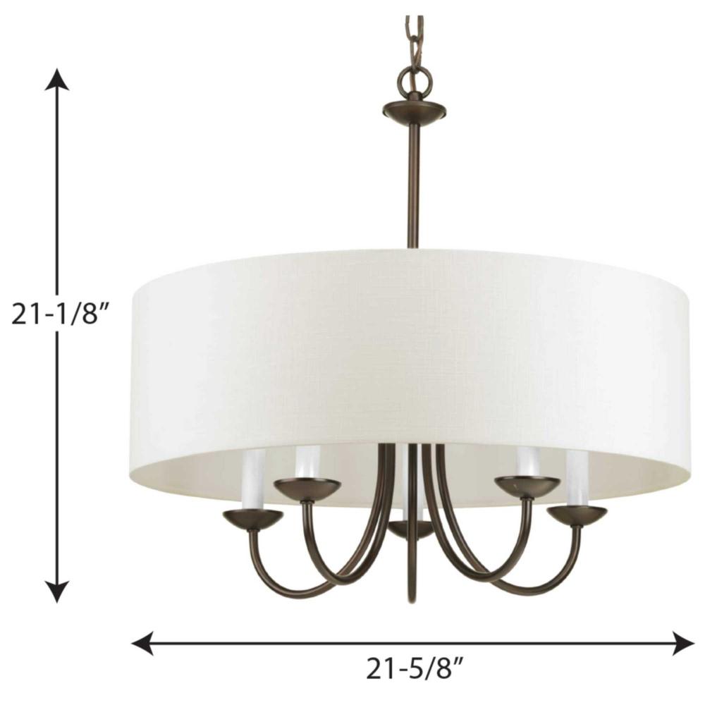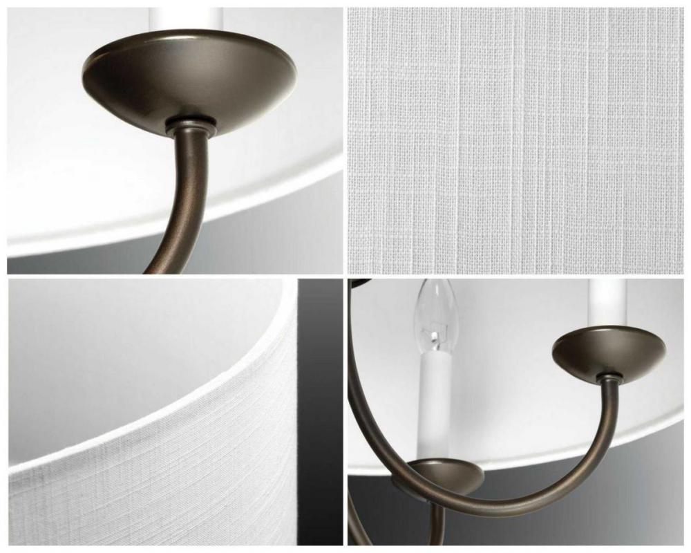 Freshen your home décor with a chandelier from the Drum Shade Collection. Light sources glow from within a crisp white textured fabric shade that gives a country-casual feel to this classic light fixture. The gently curving arms are coated in a beautiful antique bronze finish. A perfect piece for gracing an entryway or exuding a light over a meal at your dining table or breakfast nook.