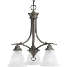 Three-light chandelier with etched glass featuring soft angles, curving lines and etched glass shades. Gracefully exotic, the Trinity Collection offers classic sophistication for transitional interiors. Sculptural forms of metal and glass are enhanced by a classic finish. This transitional style can transform a room or your whole home with its charming versatility.