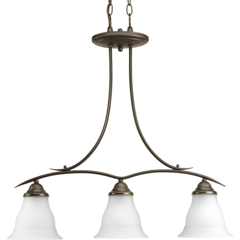 Three-light linear chandelier featuring soft angles, curving lines and etched glass shades. Gracefully exotic, the Trinity Collection offers classic sophistication for transitional interiors. Sculptural forms of metal and glass are enhanced by a classic finish. This transitional style can transform a room or your whole home with its charming versatility.