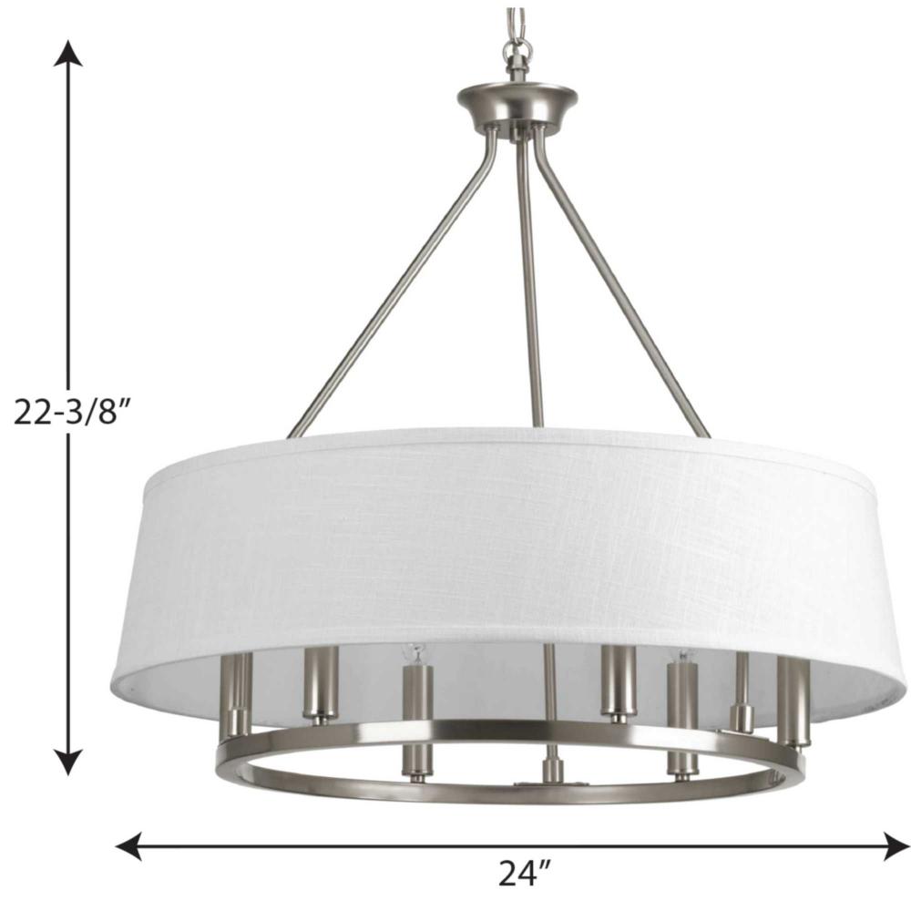The Cherish 6-light chandelier is a modern take on a classic silhouette. A simple round frame is coated in a soft brushed nickel finish and topped with six columns holding candelabra base bulbs. An elegant summer linen drum shade surrounds the frame. Soft light is cast downward onto the surface below. This lovely chandelier is a focal point for dining rooms or great rooms in coastal, traditional and various other settings.