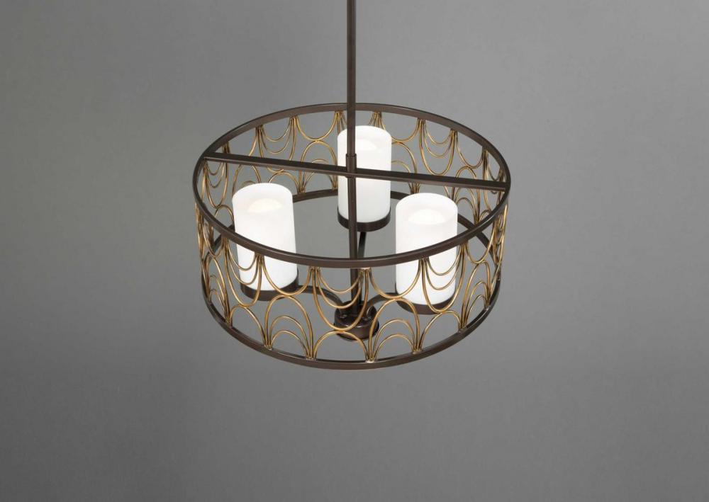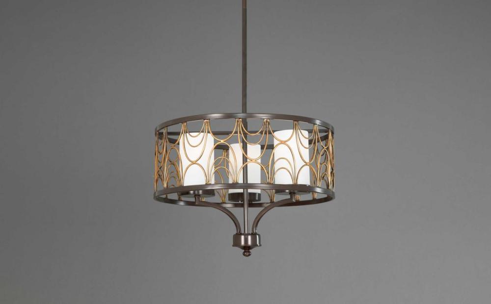 Hand formed arching elements.;Etched white glass complements the artistic frame.;Artistic painted finish that feathers from a rich bronze tone to a vintage brass accent.;Includes one 6", four 12" stems and 6 Links of chain.