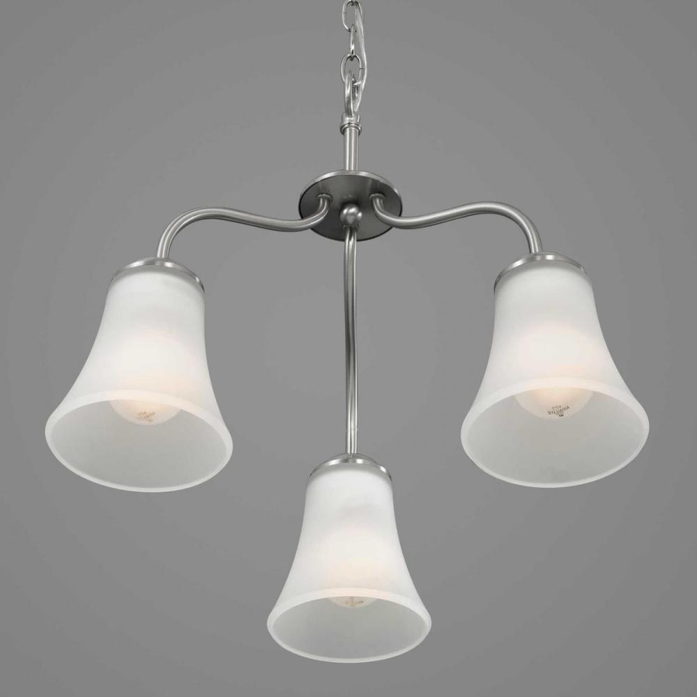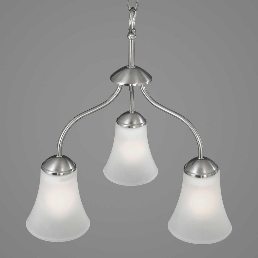 Traditional details and graceful lines provide modern elegance to any interior. The Classic three-light chandelier features etched glass shades with a Brushed Nickel finish.
