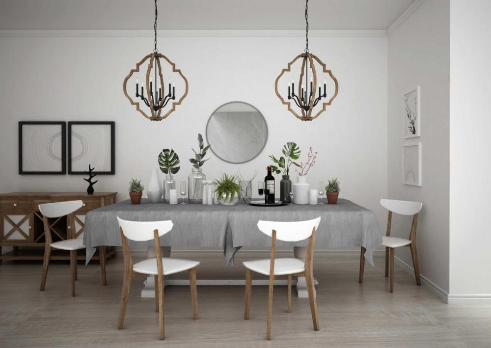 The statement-making six-light Spicewood pendant features a rich, solid wood surrounded in a classic quatrefoil pattern. Wrought iron metal fittings in a Gilded Iron finish are paired with a distressed pine frame to complement rustic and reclaimed design styles.