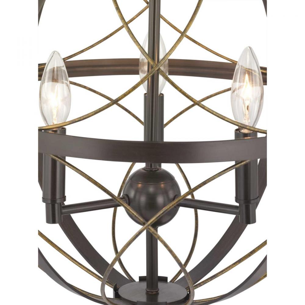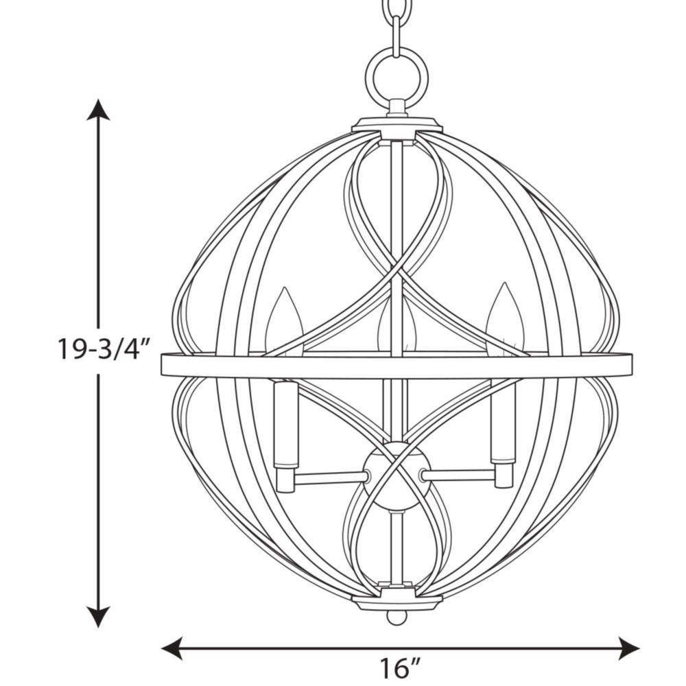 The interplay of round and elliptical curves surrounding a candelabra cluster invites energy and interest into a host of settings;The three-light pendant is beautifully suited for a home office, den, family room, or in a grouping hung within a tall stair h