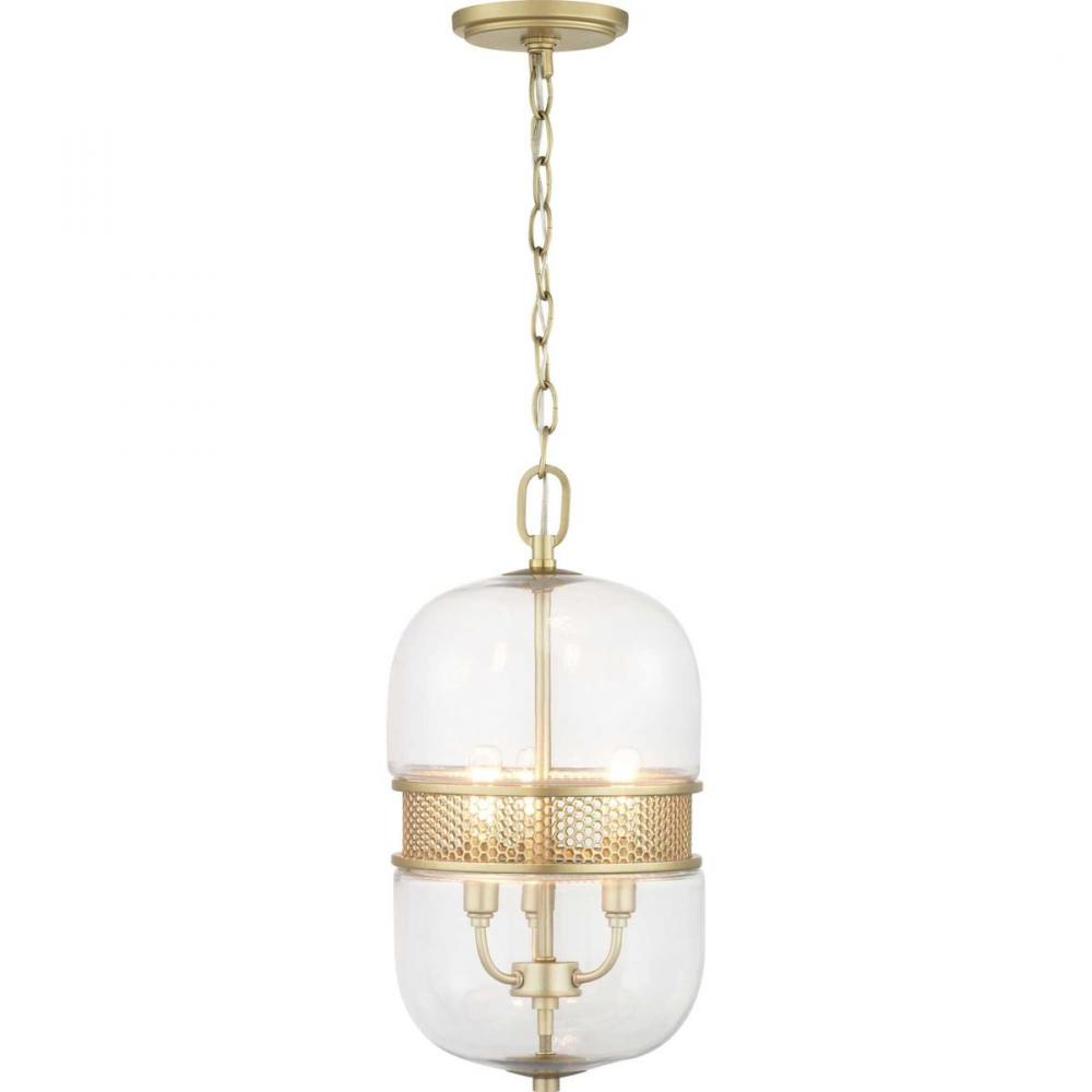 Cayce’s capsule silhouette showcases an interior candelabra cluster. An interlocking hexagonal design gracefully adorns the middle of the glass to add visual interest. This three-light pendant is in a beautiful Vintage Gold finish. Flush with personality, the Cayce Collection pendant provides a unique design style suitable for a variety of interiors, including Modern, Farmhouse, Urban Industrial and Luxe.