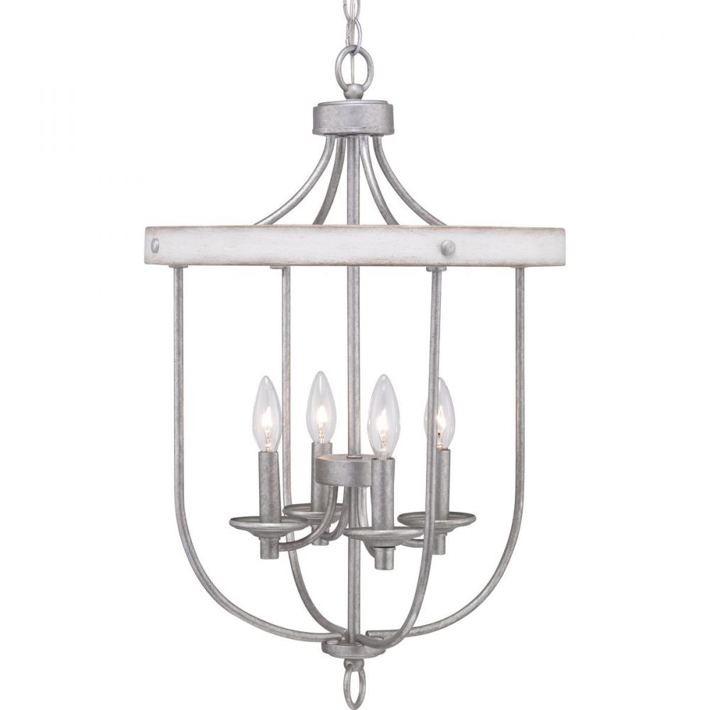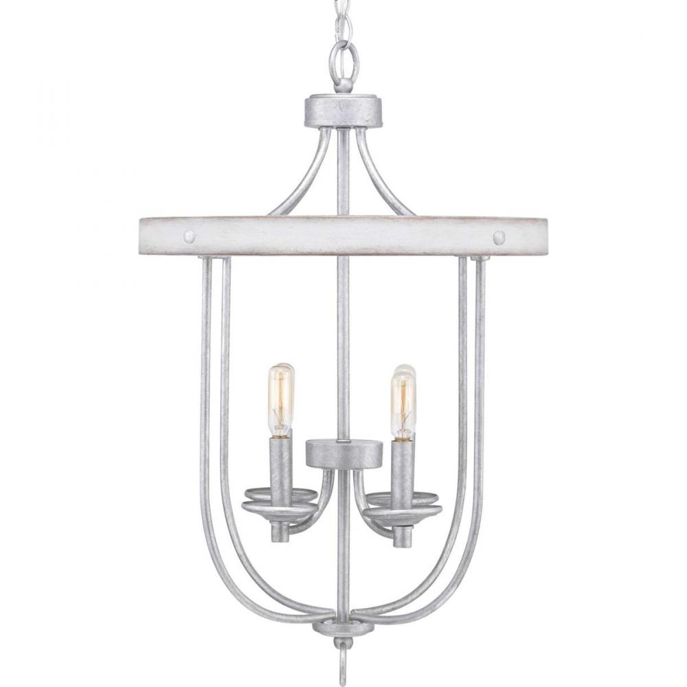 The four-light foyer in the Gulliver Collection features arching and delicate details that curve to create an airy design. Dual toned frame color combinations in a Galvanized finish with antique white accents The hand painted wood grained texture finished to emulate weathered driftwood complements Rustic and Modern Farmhouse home decor, as well as Urban Industrial and Coastal interior settings.