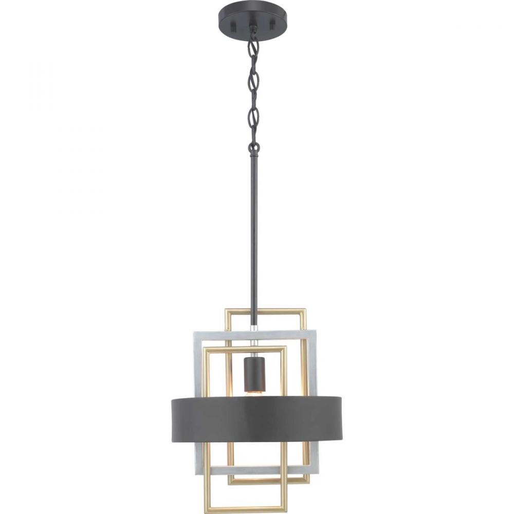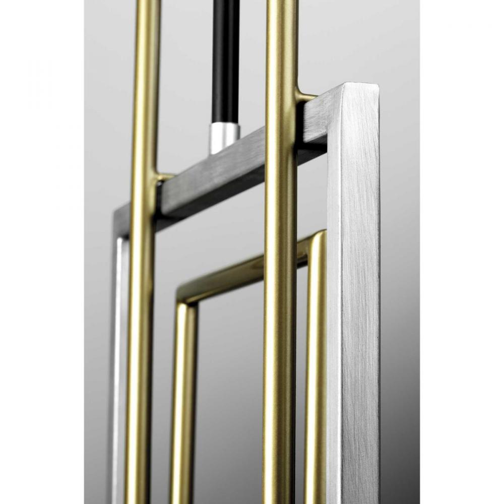 An array of geometric patterns in Adagio one-light pendant is a nod to the musical description of a tender and melodic tone. The modern design features lights that are distributed around a circular Black band. Mixed metal elements, which are present in Brushed Silver and Brushed Brass accents, can complement monochromatic color palettes that are popular in homes today. Each fixture in the Adagio collection creates a focal point and is ideal for Luxe and Modern interiors.