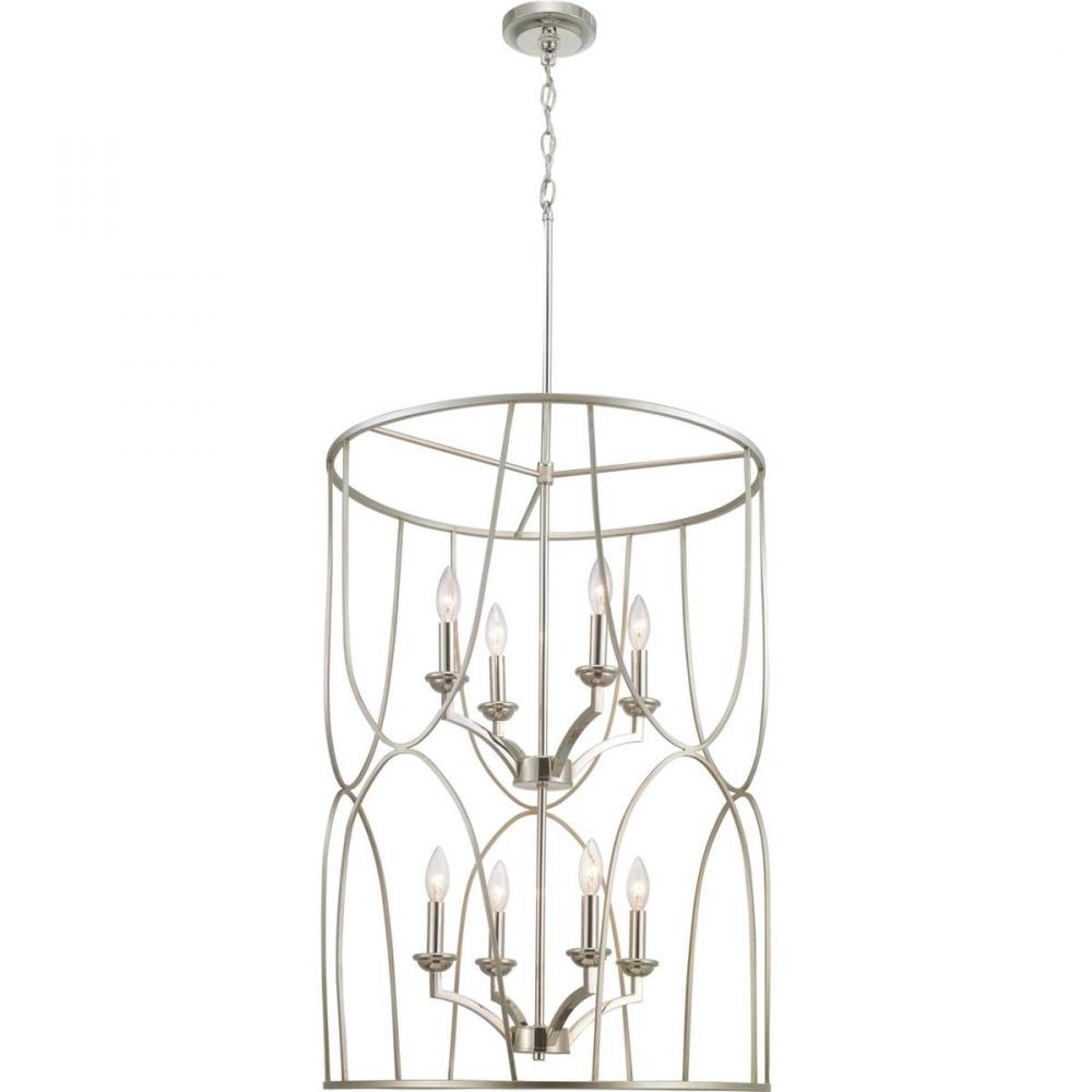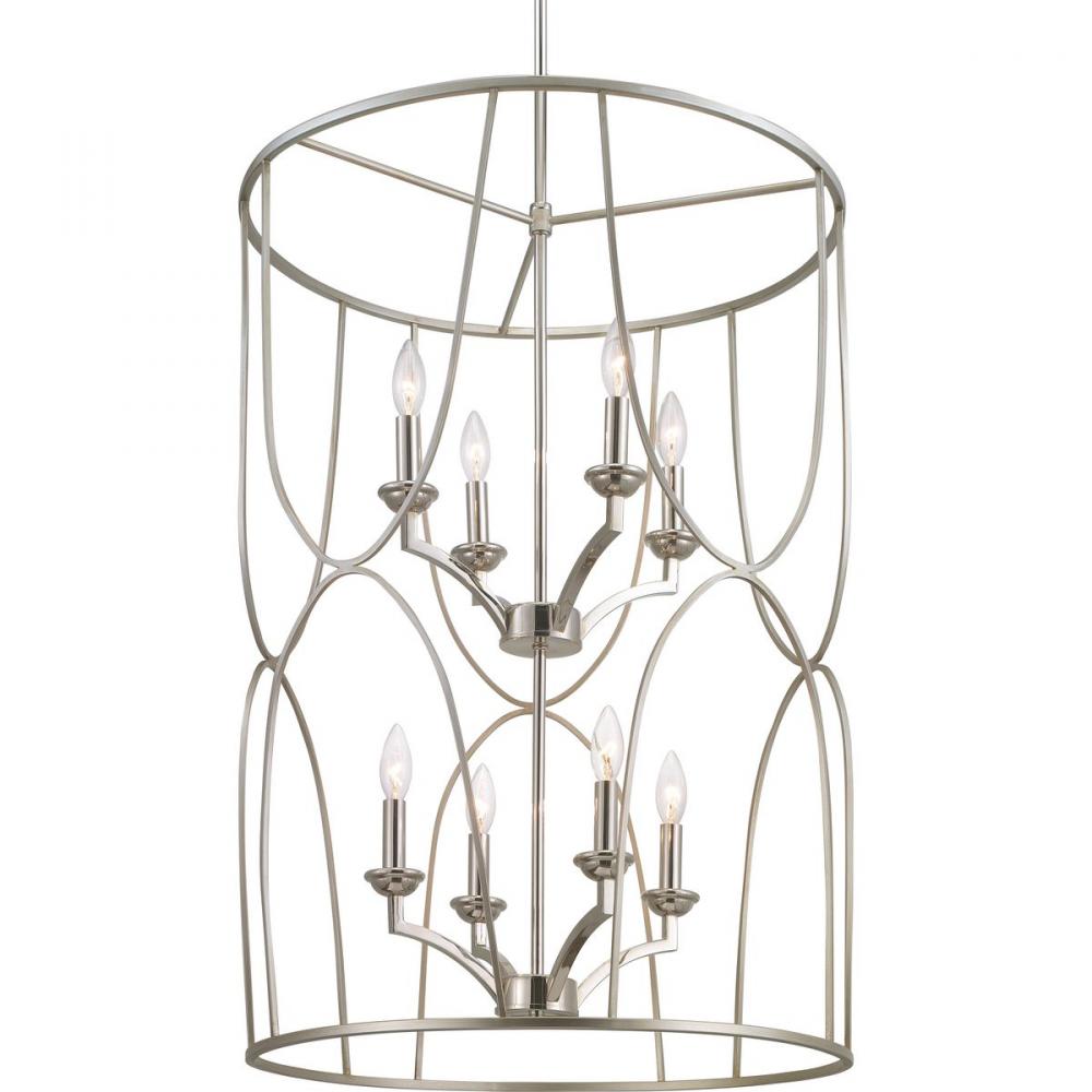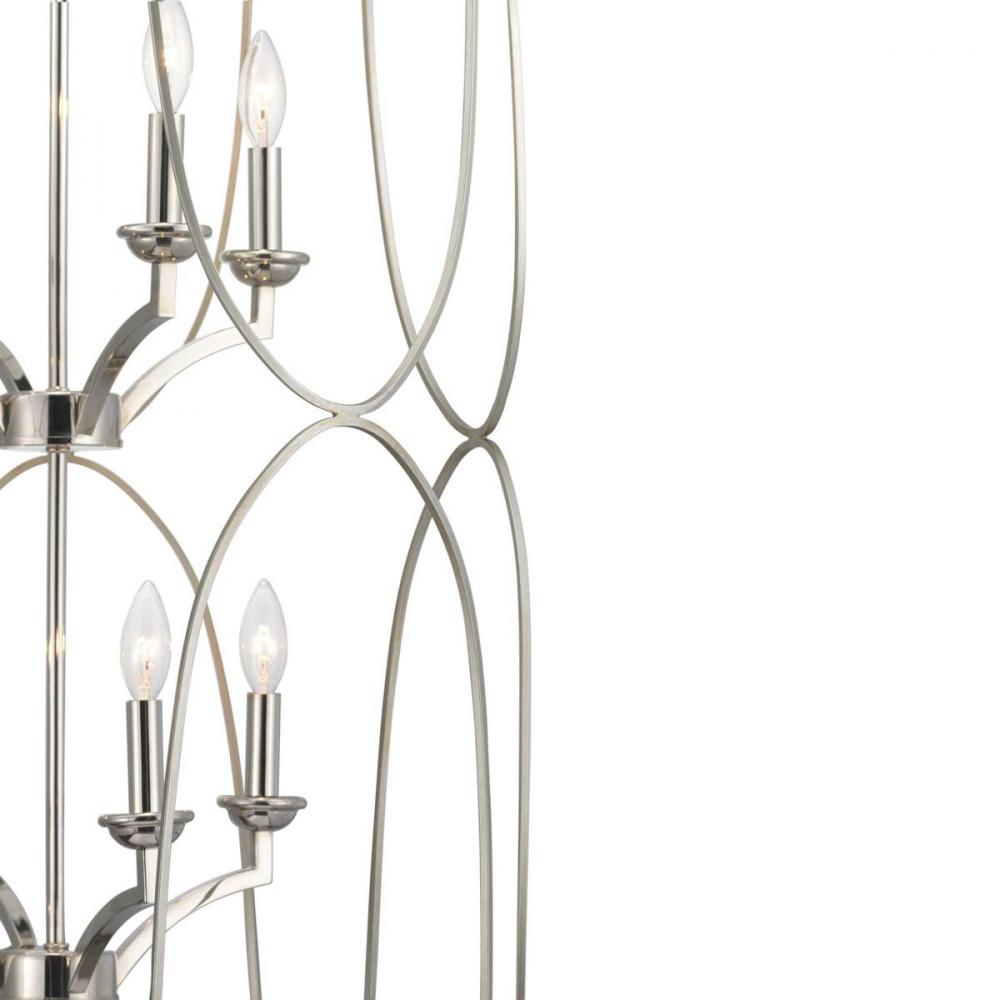 An eight-light inner cluster in Polished Nickel appears to float inside a Silver Ridge geometric outer cage in this Landree Collection foyer fixture. The frame is designed to dramatically surround each fixture, presenting depth, dimension and beauty. The exaggerated scale and elegant accents are suitable for Modern and Luxury design styles.