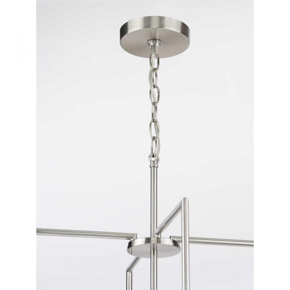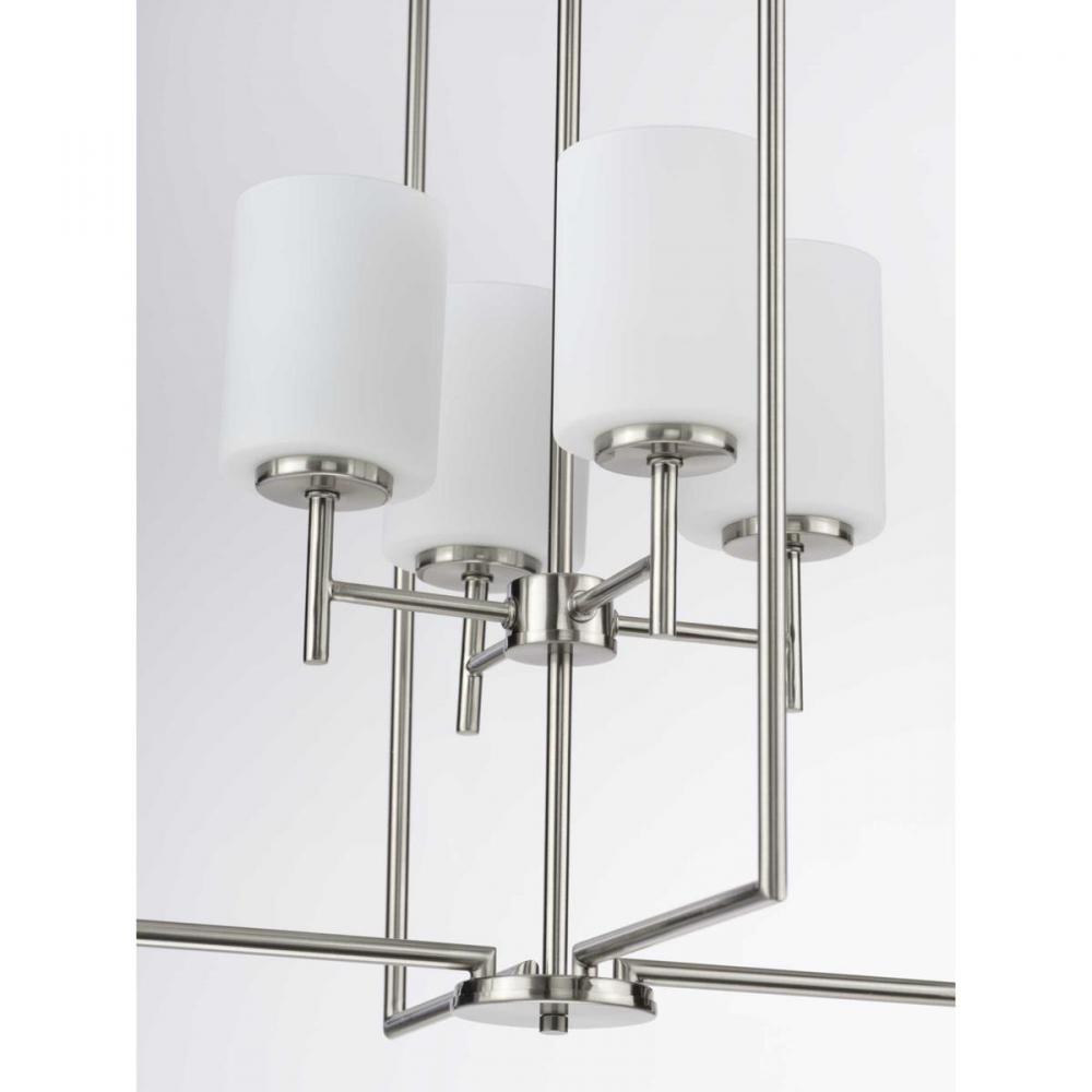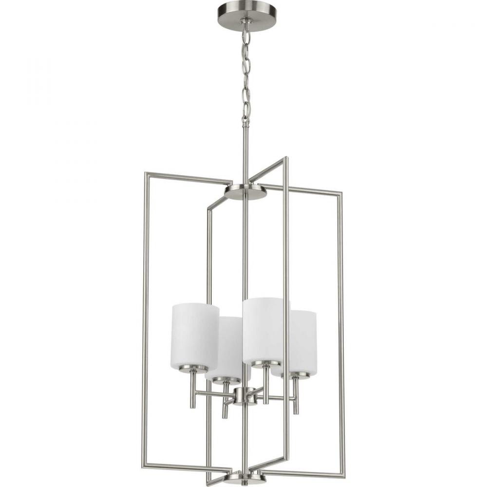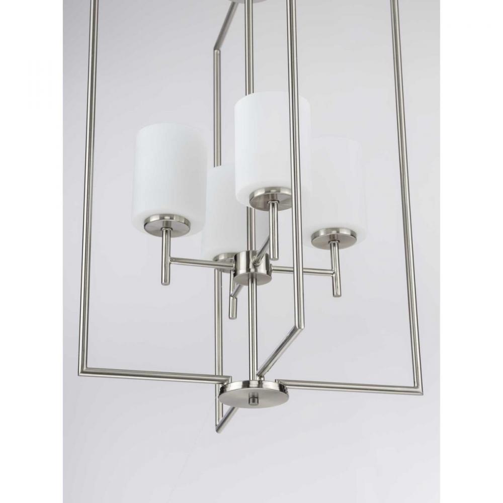 Clean, simple lines finished in a quietly reflective Brushed Nickel take center stage in the Replay four-light foyer pendant. Two elongated, rectangular frames intersect above and below a gathering of etched glass diffusers elegantly congregating at the fixture’s center. The clean, simple lines in this design make it perfect for hanging in a foyer or over a dining table or kitchen island in transitional and modern interiors.