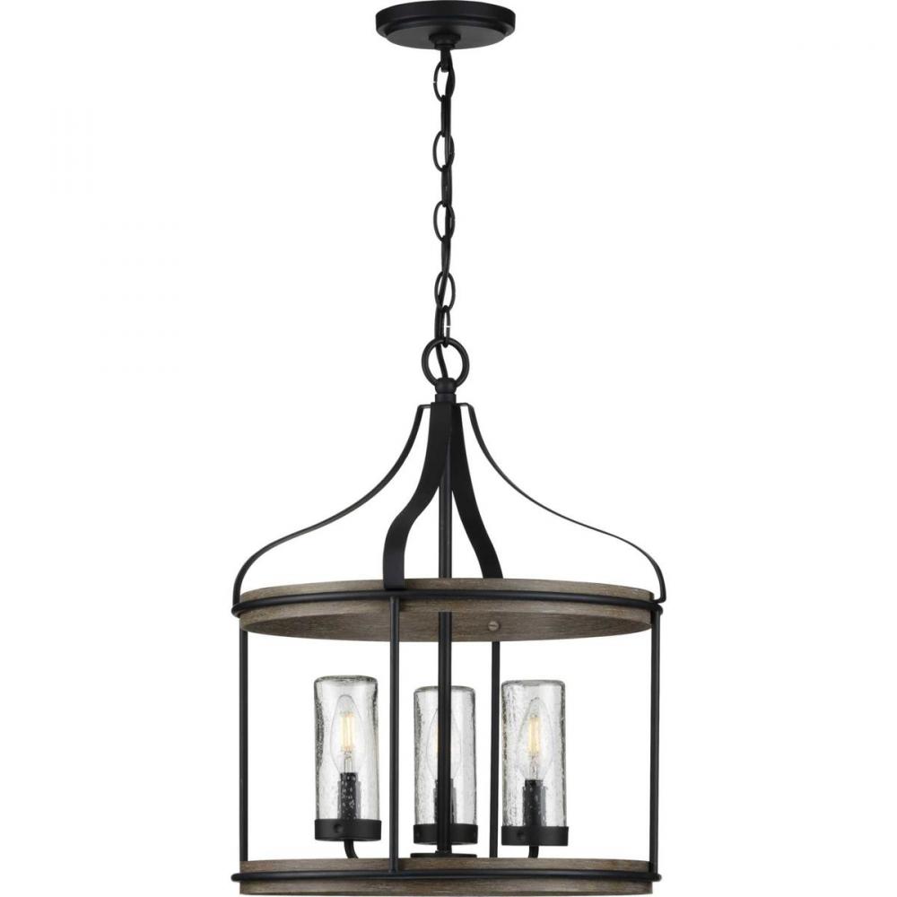 The Brenham Collection Three-Light Black Pendant Offers A True Farmhouse Feel With Its Mixed-Elements Design. Hand-Painted Weathered Gray Faux Wood Accent Rings Bookend The Top And Bottom Of The Light Fixture. A Black Metal Frame With Simple Metal Bars And Ribbon-Like Metal Arms Reach Down From A Central Metal Link Chain. The Frame Holds Clear Seeded Glass Shades In Place That Add Extra Visual Character.