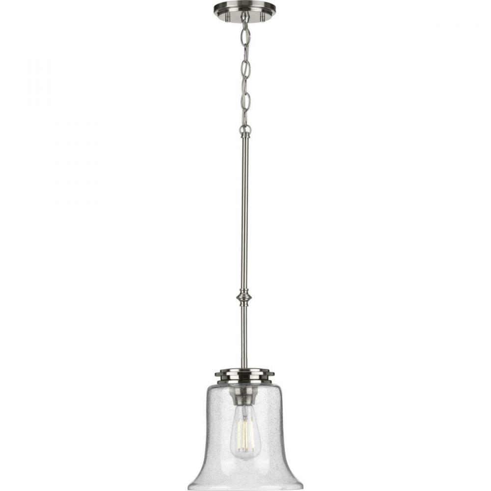 Immerse yourself in a home atmosphere primed for relaxation and inspired thinking with the beautiful craftsmanship of this mini-pendant. Savor this fresh take on a classic light choice as your gaze traces a sleek stem that extends down from a round ceiling plate to a beautiful brushed nickel light base. A lightly seeded glass shade adds an unexpected, but welcomed dash of modern personality to this clean, traditional design.