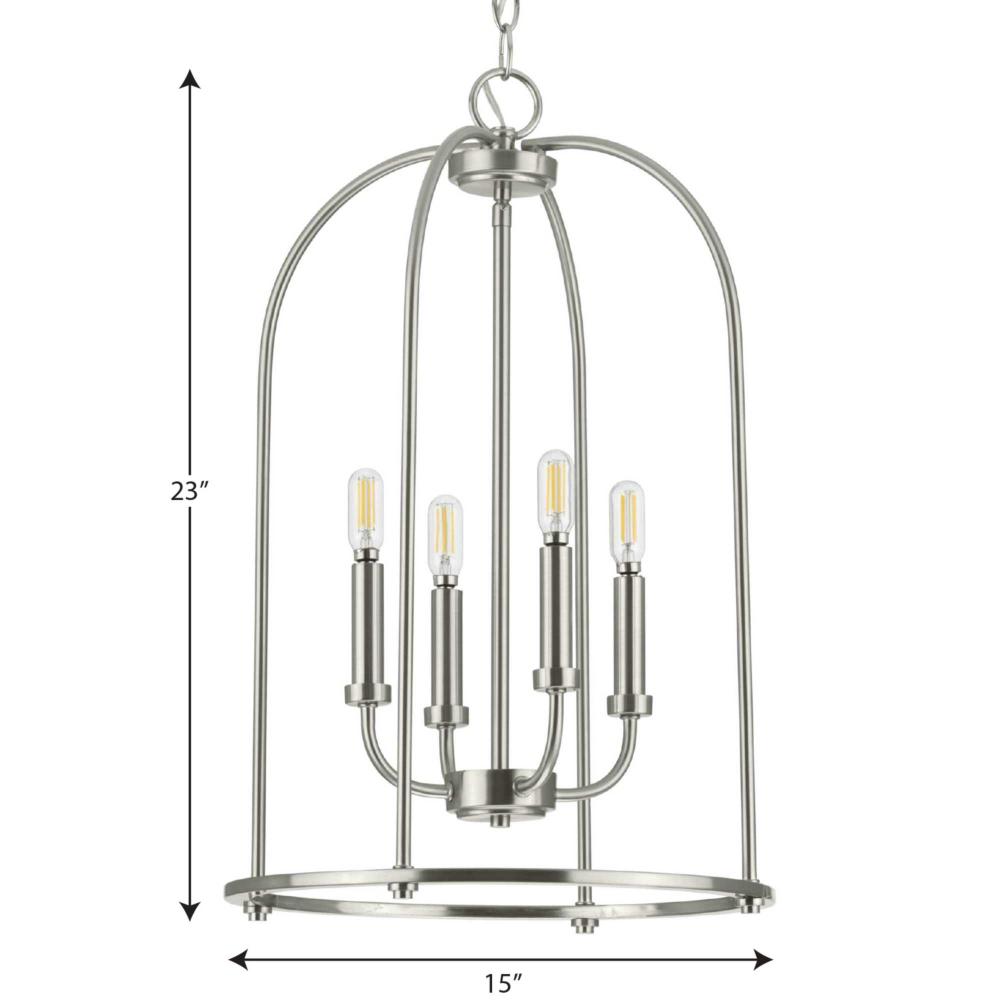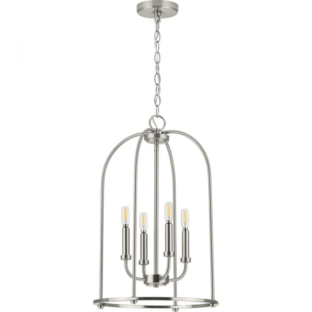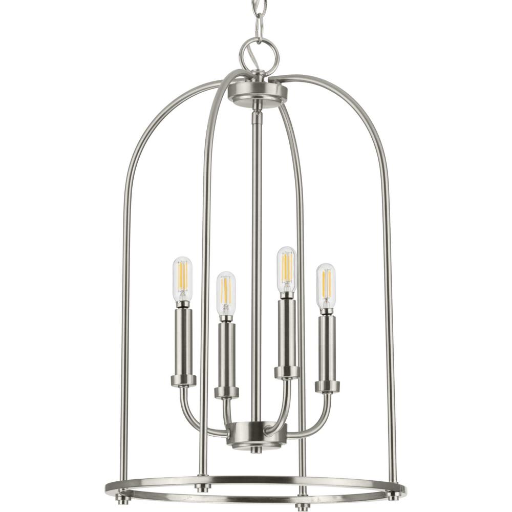 Complement your interiors with the Leyden Collection 4-Light Brushed Nickel Farmhouse Foyer Pendant Light. The gorgeous open-frame and candlestick light bases are coated in a beautiful brushed nickel finish. Light sources glow from atop the smooth light bases for graceful illumination.