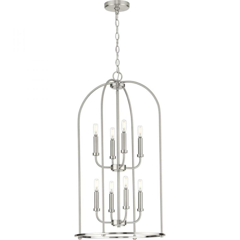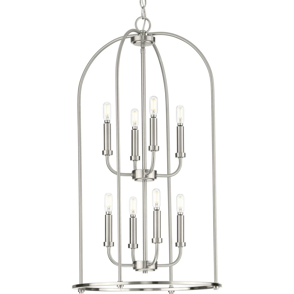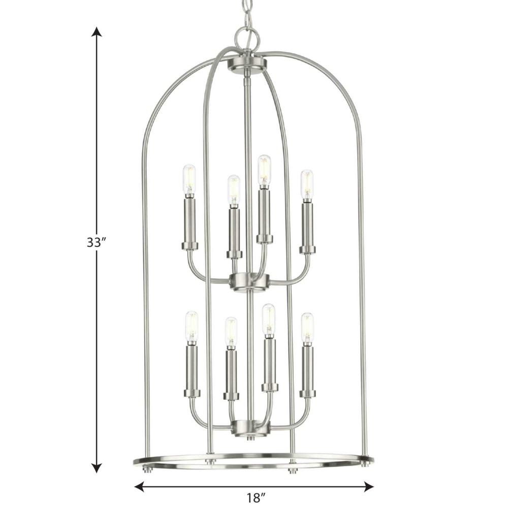 Complement your interiors with the Leyden Collection 8-Light Brushed Nickel Farmhouse Foyer Pendant Light. The gorgeous open-frame and candlestick light bases are coated in a beautiful brushed nickel finish. Light sources glow from atop the smooth light bases for graceful illumination.