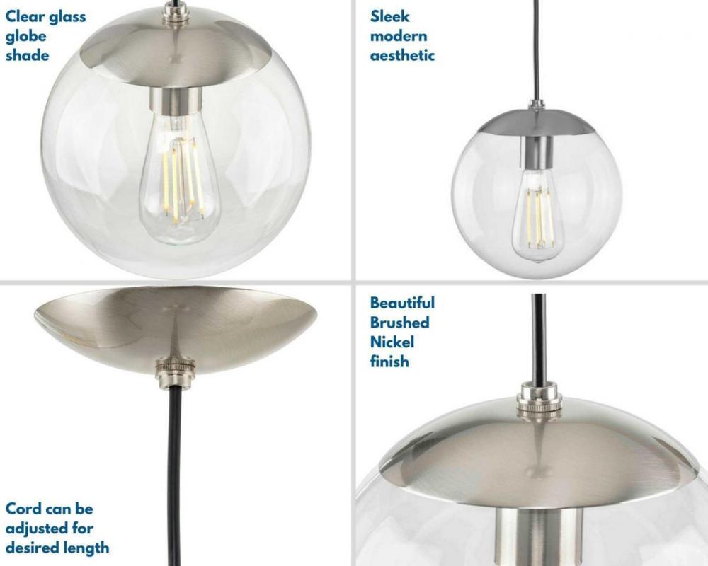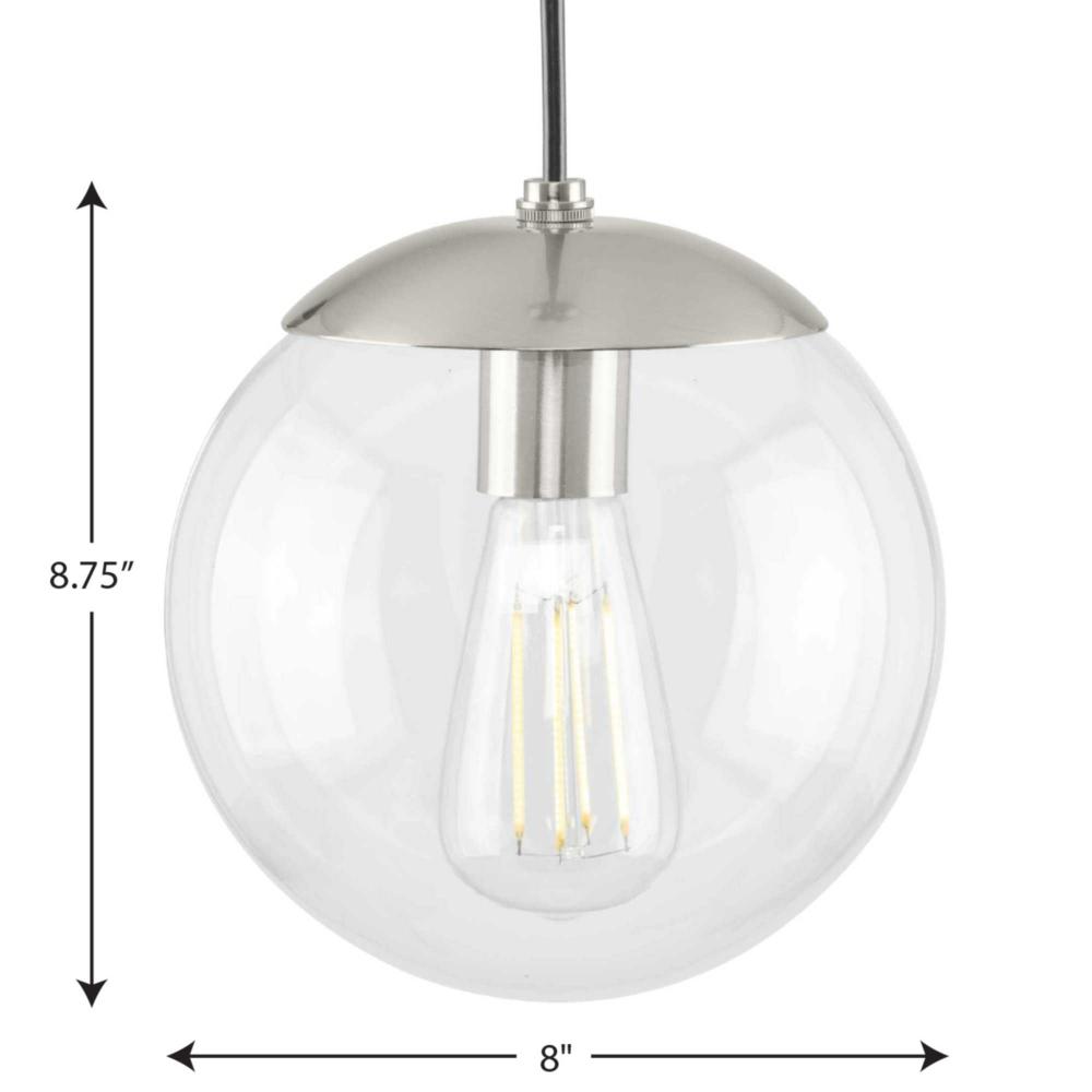 Embrace a statement-making lighting design with the Atwell Collection 1-Light Glass Globe Brushed Nickel Modern Pendant Light. A light source glows from within a clear glass globe shade that fosters a soft and enduring design. The metal cap and light base are coated in a beautiful brushed nickel finish that accentuates the design's modern aesthetic. The light hangs from a cloth cord that can be adjusted for height to meet your unique design needs.