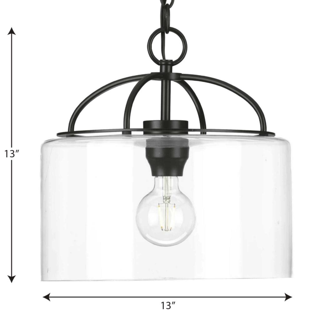Complement your interiors with the Leyden Collection 1-Light Matte Black Clear Glass Farmhouse Pendant Light. The gently curving arms and light base are coated in a beautiful matte black finish. A light source glows from inside a clear glass shade.