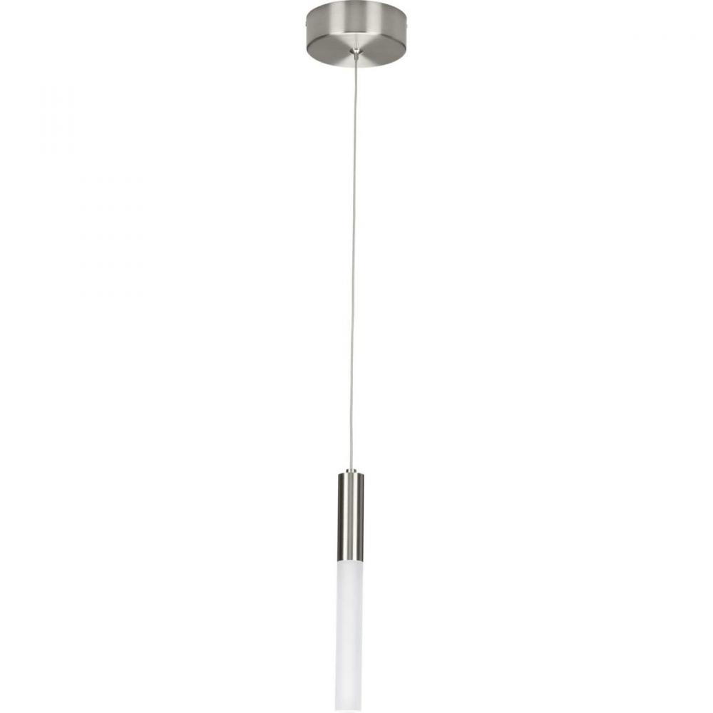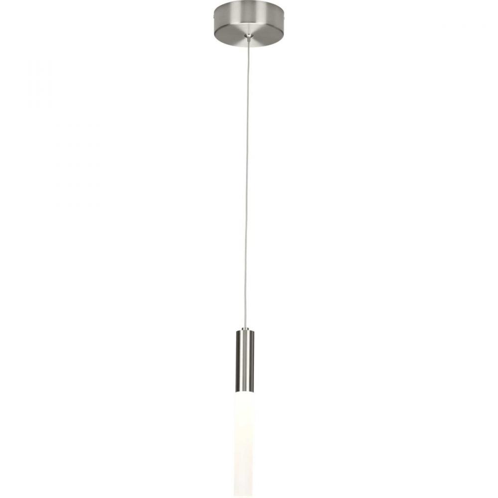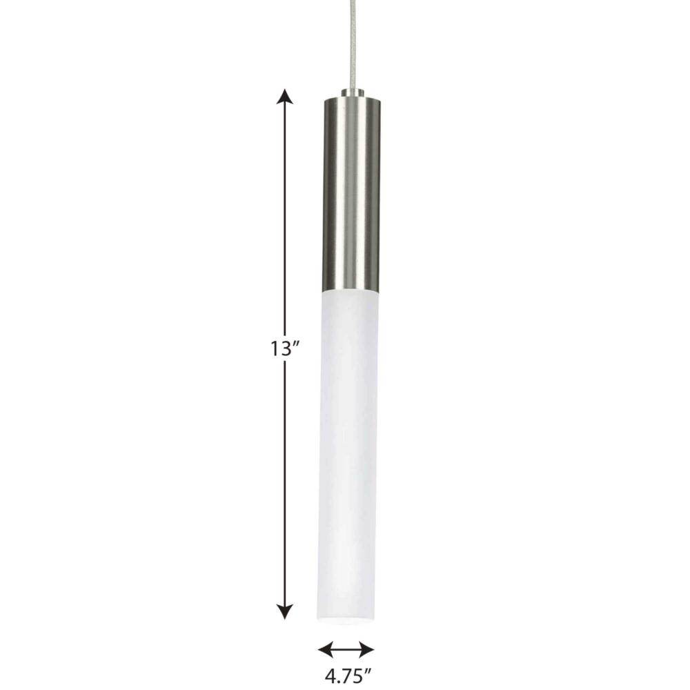 Manifest a futuristic effect with the Kylo LED Collection 1-Light Brushed Nickel Frosted Acrylic LED Modern Hanging Pendant Light. Sleek metal light base coated in a beautiful brushed nickel finish and attached to a steel cable is sure to add drama to a room's design. Crisp frosted shade creates a seamless tube of illumination.