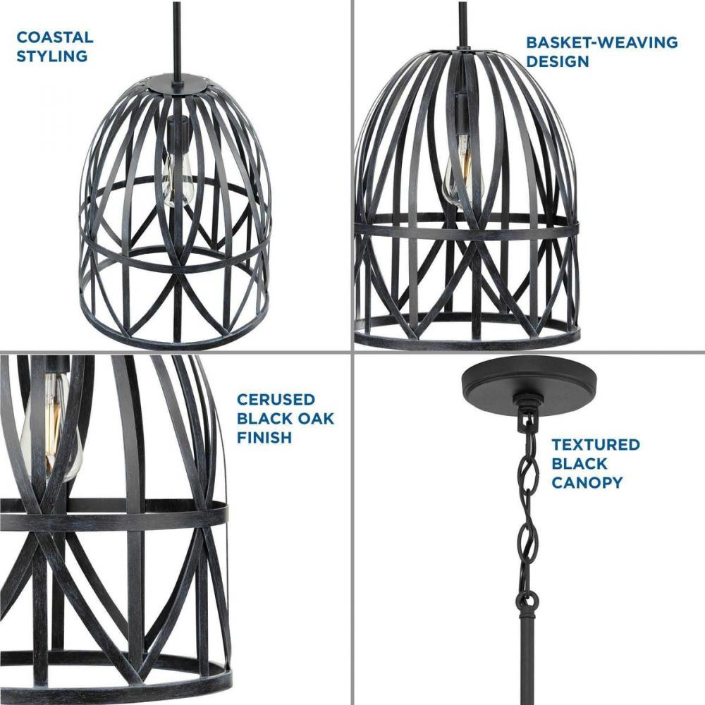 Ideal for a kitchen, dining room, or bar;Perfect for farmhouse, global, and coastal style settings;Classic cerused black oak finish with textured black accents;Cerused black oak metal shade;Includes 63-inch chain to adjust for a variety of ceiling heights;