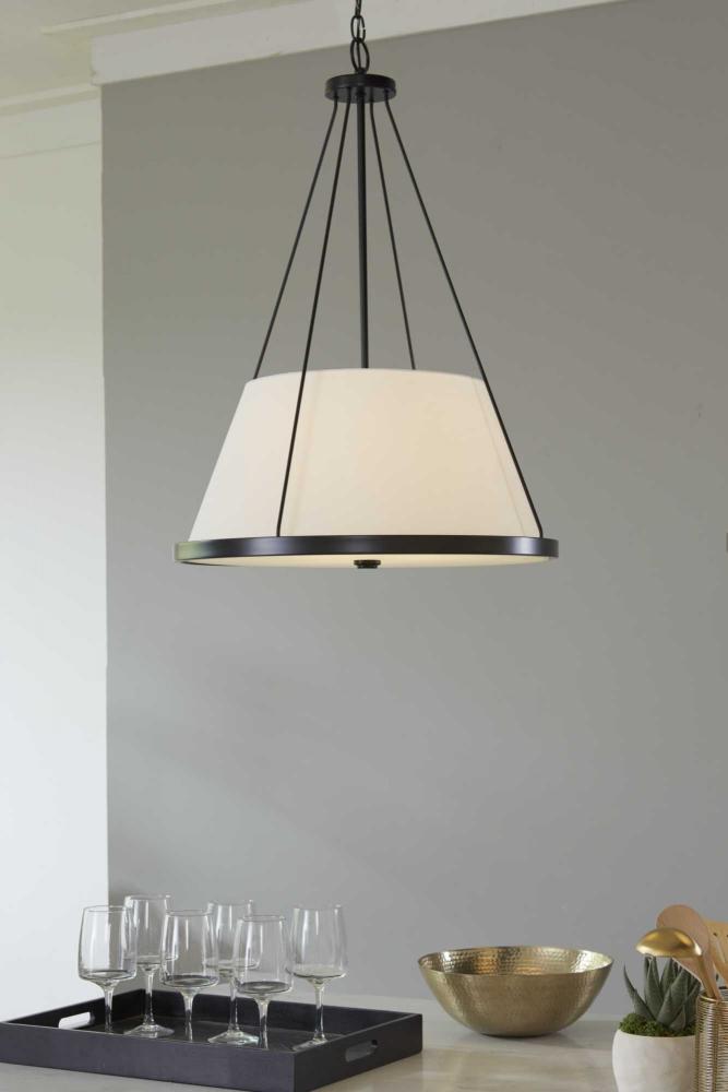 Both modern and traditional elements combine for a versatile look in the Saffert pendant. Four slender rods capture a circular metal frame and glass diffuser. A fabric shade softens the clean style of the pendant. Saffert is the perfect choice for kitchens, hallways, foyers and great rooms in new traditional, industrial and luxe interiors.