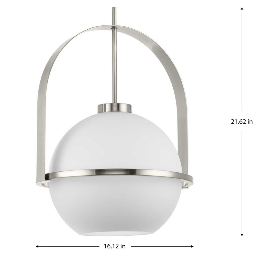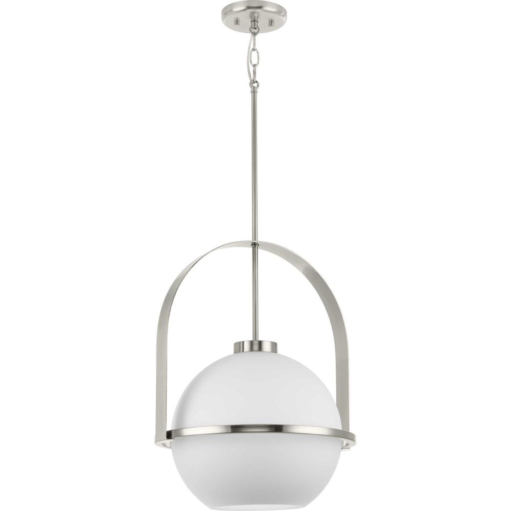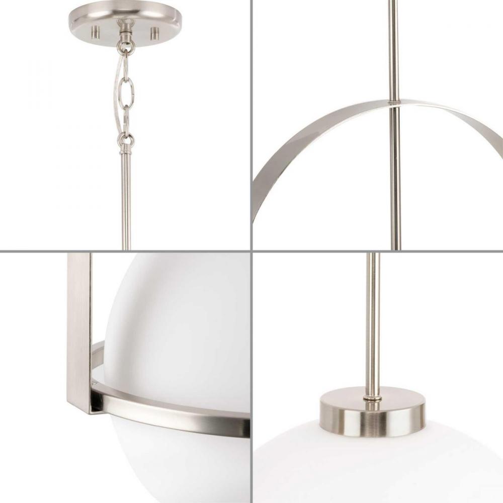 Delayne has a sophisticated style that transcends its simple design. A softly curved fitted metal framework encases an opal glass globe with slender bands creating a dynamic form. The pendant offers a refined mid-century design enhanced by gently diffused light that creates an ambient glow.