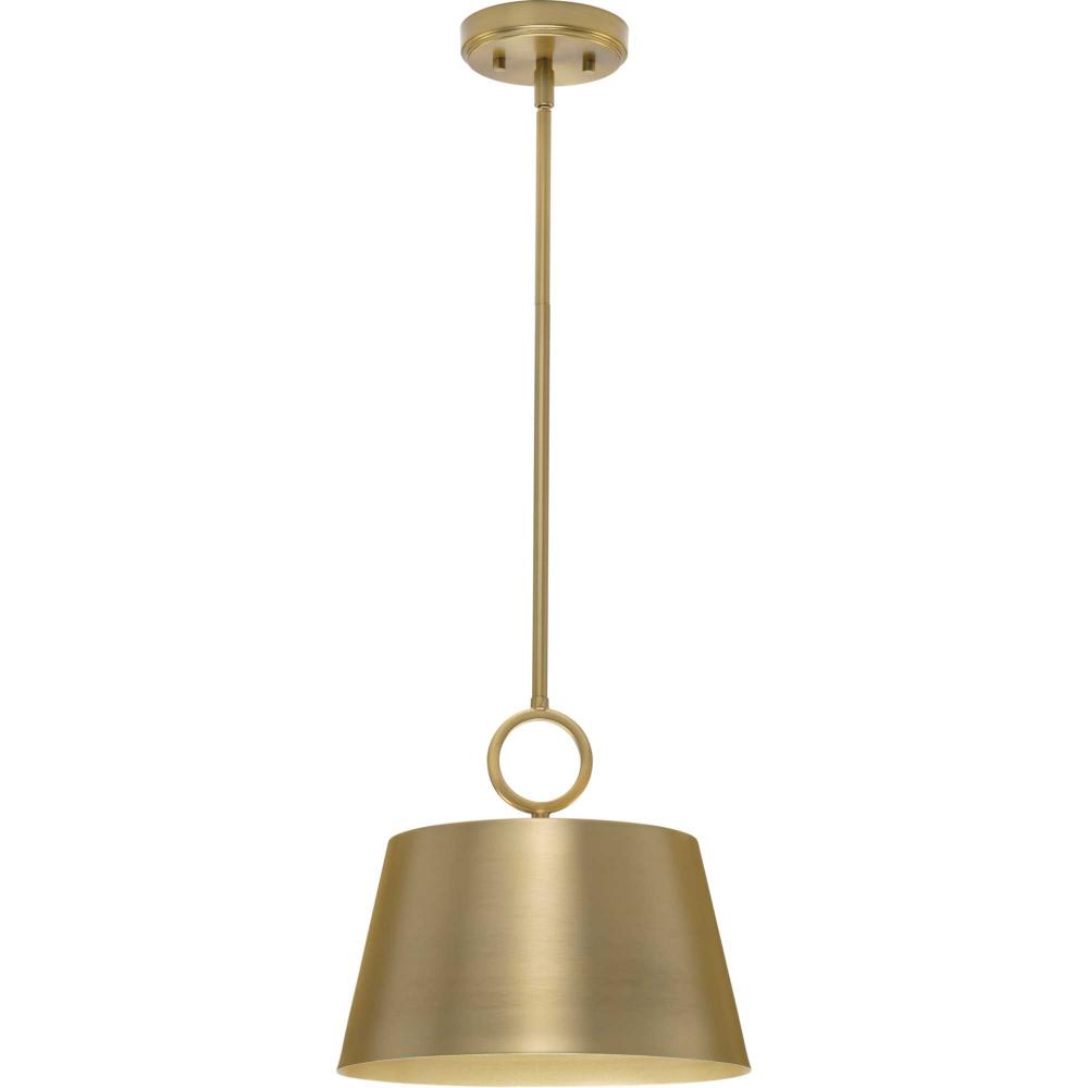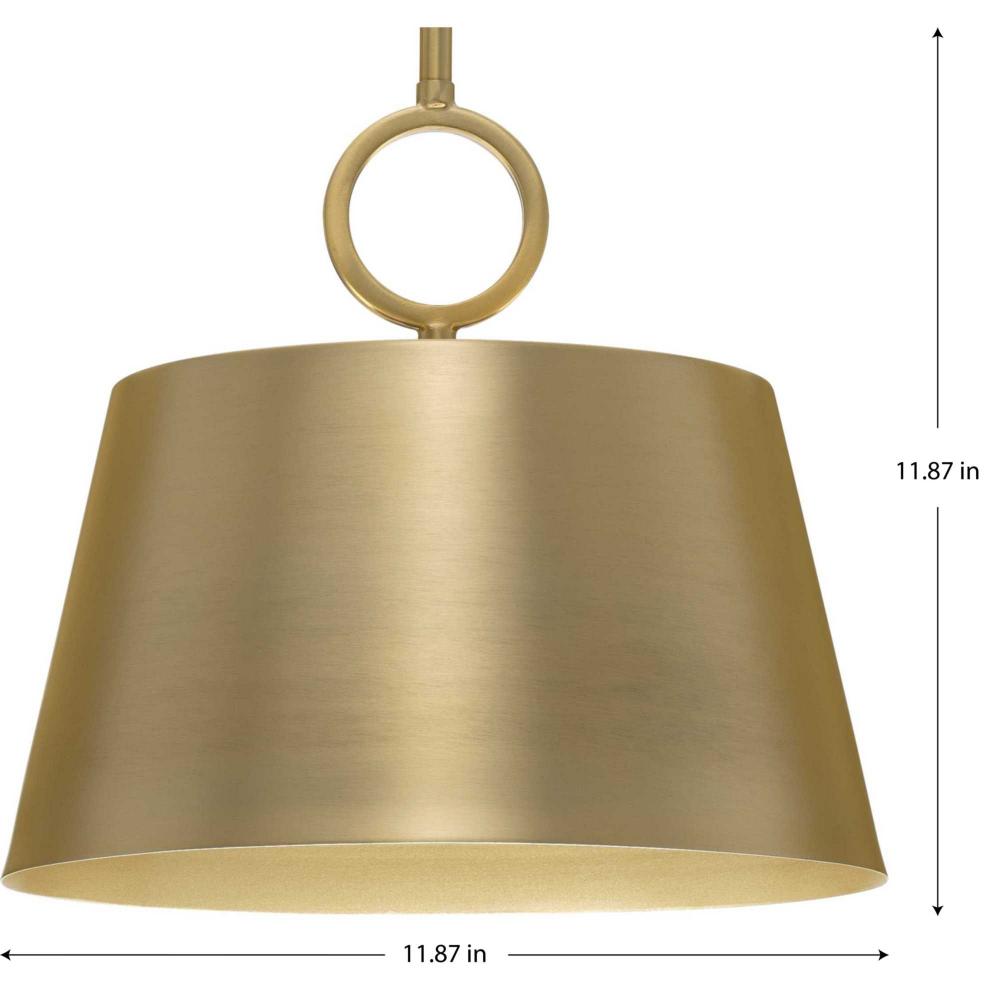 The Parkhurst pendant features a crisp dome metal shade suspended by an elegant ring. Light gleams softly from within the gold-finished interior, casting a soft glow on the surfaces below. This substantial pendant has warmth and depth and is ideal for new traditional, modern farmhouse, and transitional interiors.