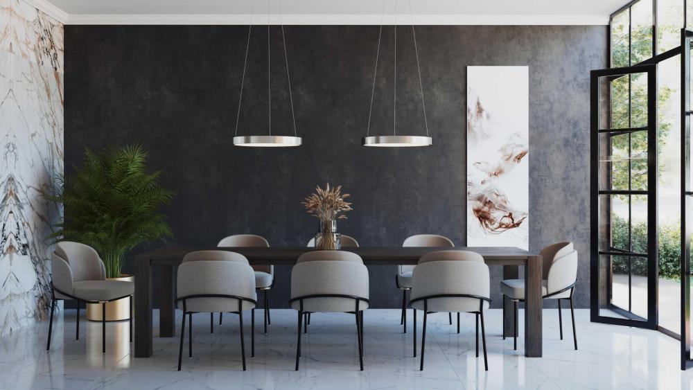 A simple halo suspended by airy cables brings a minimal, sleek style to Inverse LED, making it perfect for living rooms, great rooms, and dining rooms;Its elegant form makes a dramatic statement in for modern, mid-century modern and contemporary interiors;