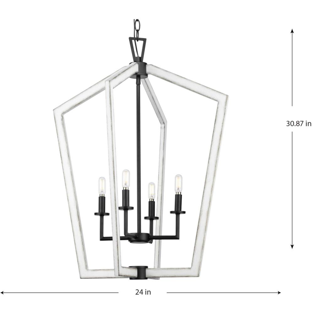 Clean, modern lines combine with rustic elements in the Galloway Collection. A lightly distressed white finish highlights an open, angular frame suspended from a triangular loop detail attached to an adjustable chain and simple round canopy, all finished in crisp matte black. Matte black columns hold candelabra lights that glow brightly within the stately form to illuminate spaces in a casually elegant style. The larger scale and airy design of this foyer light makes it the perfect accompaniment for great rooms, bedrooms and dining rooms.