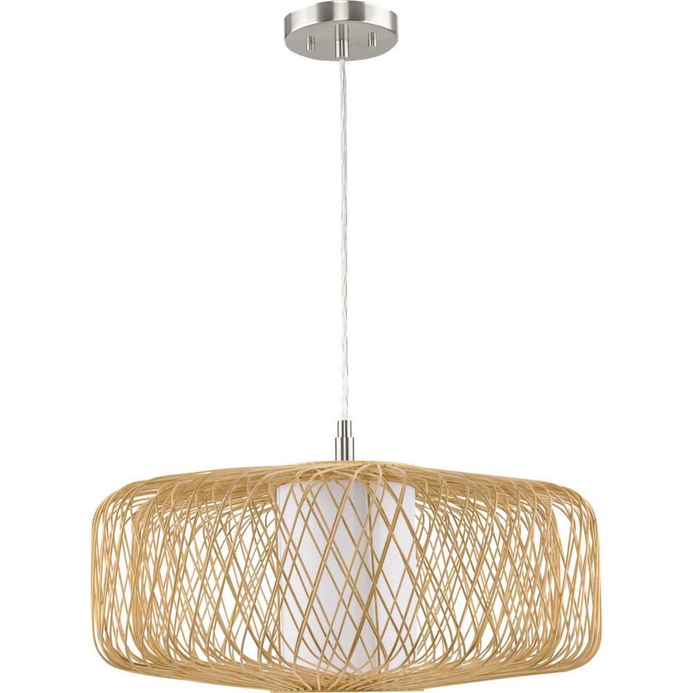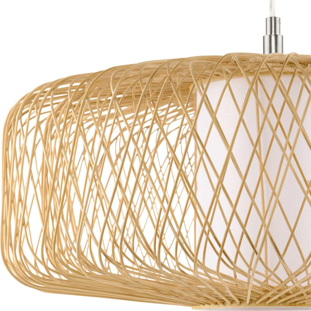 The pendant features a white linen fabric diffuser surrounded by a natural rattan shade