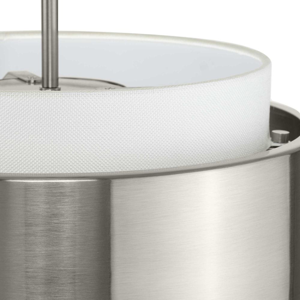 The Silva Collection uses a dramatic contrast of finish and material to present a captivating design. A white linen shade encompassed by a stunning metallic drum coated in a subtle brushed nickel finish establishes a clean, modern, uplifting statement. This fixture is part of the Progress Lighting Design Series, a lighting collection offering fashionable styles and affordable luxury lighting for the home.