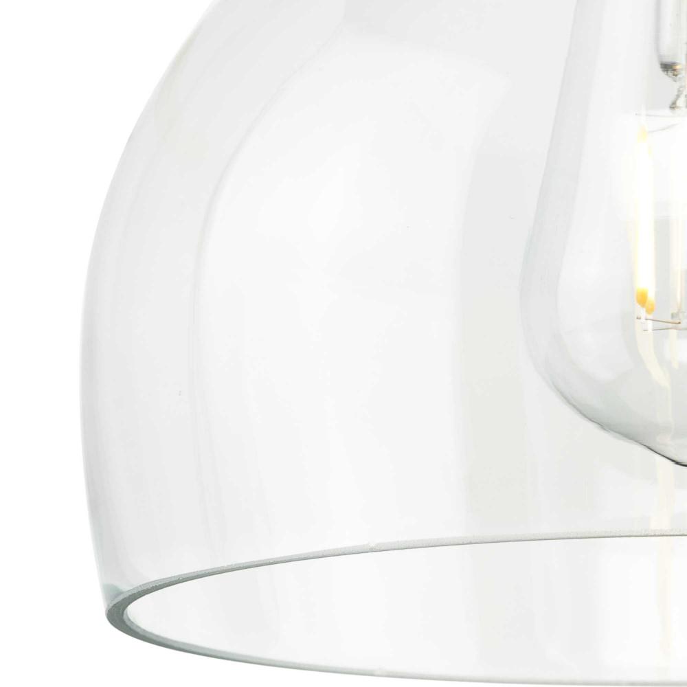 The clear glass shade is held by a cord suspension, offering a stylish modern touch