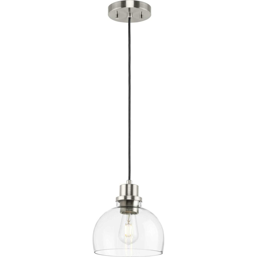The pendant features a round clear glass shade with a metal cap and canopy finished in brushed nickel