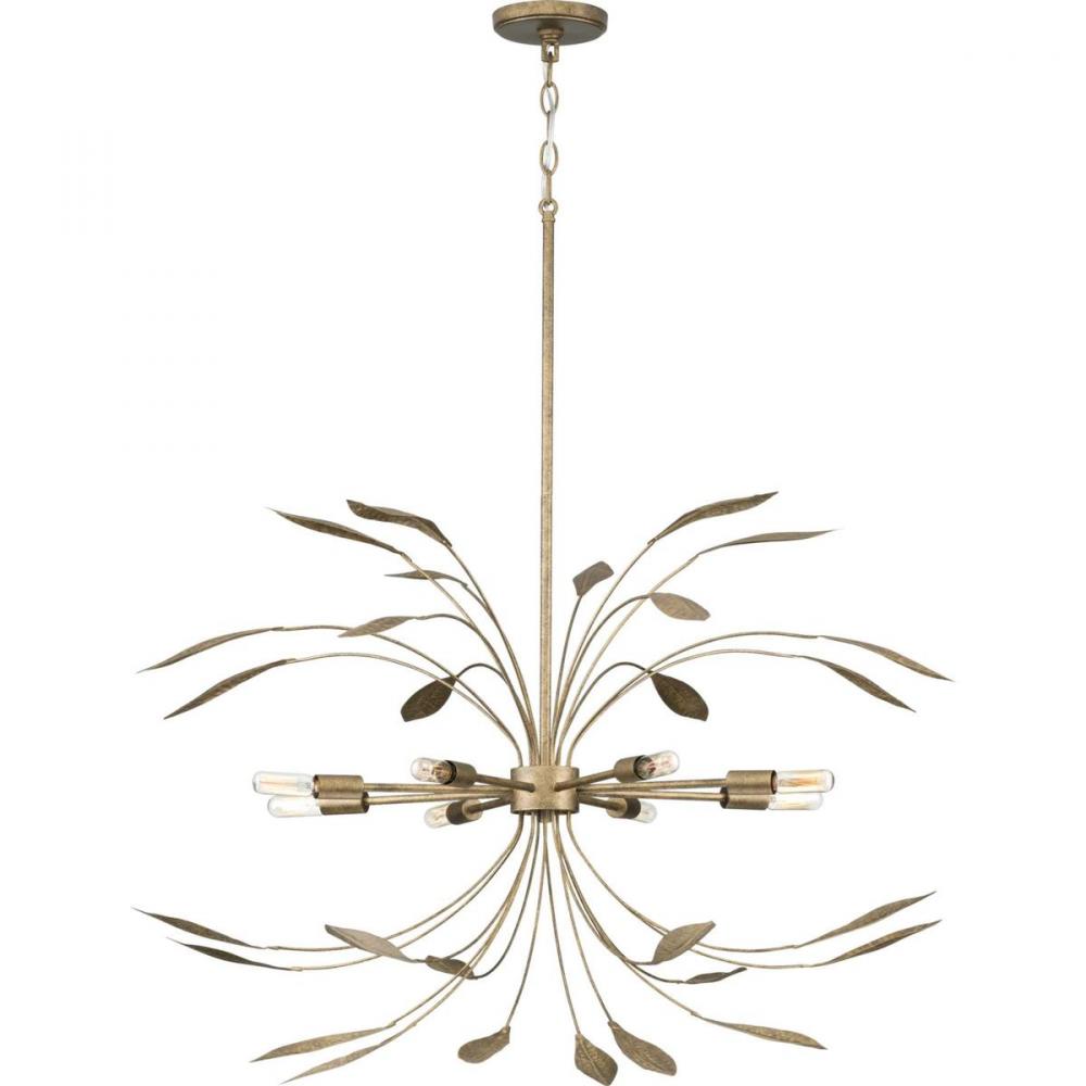 Take a naturalistic approach to modern room design with the Mariposa Collection 8-Light Antique Gold Contemporary Hanging Pendant Light. Slender branches bloom outward from the central stem bearing delicate leaves coated in a luxurious antique gold finish. The organic feel is balanced by the minimalist lines of its multi-directional light arrangement.