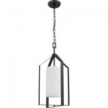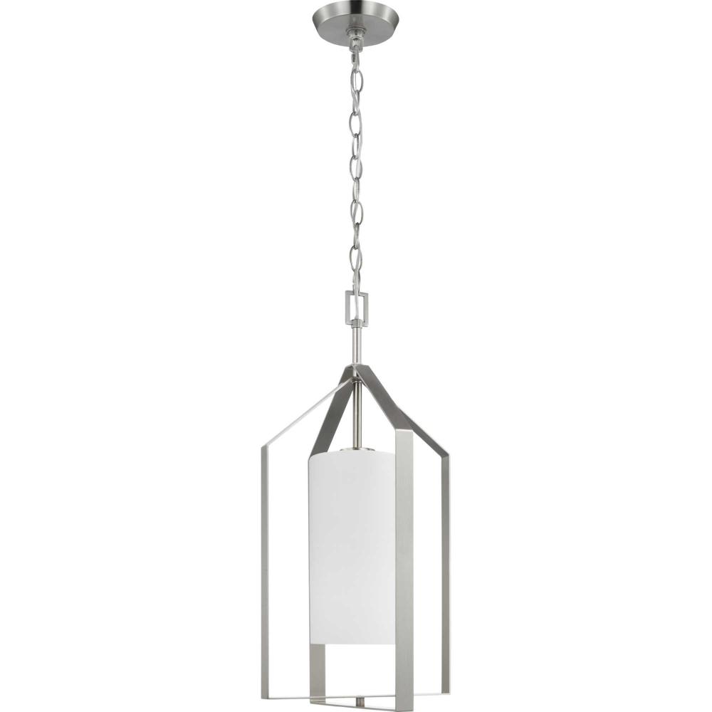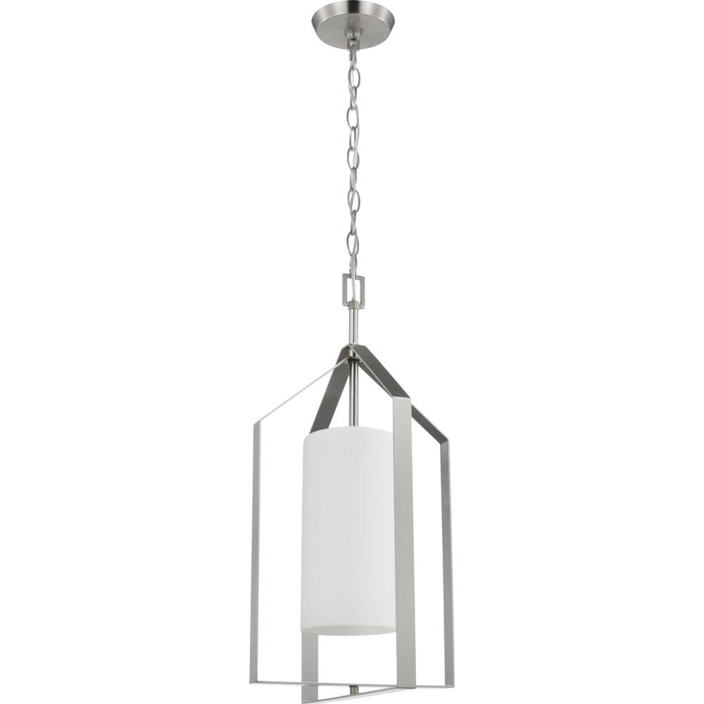 Elegantly extended, the Vertex foyer light is composed of angular forms to create a bold design that perfectly complements halls, foyers and kitchens in modern interiors. Its distinctive silhouette is coated in a brushed nickel finish. An etched glass shade offers bright illumination to spaces below. Customize the light's hanging height to your ceiling using the Included 48 in. of chain for a variety of ceiling heights and sloped ceilings.