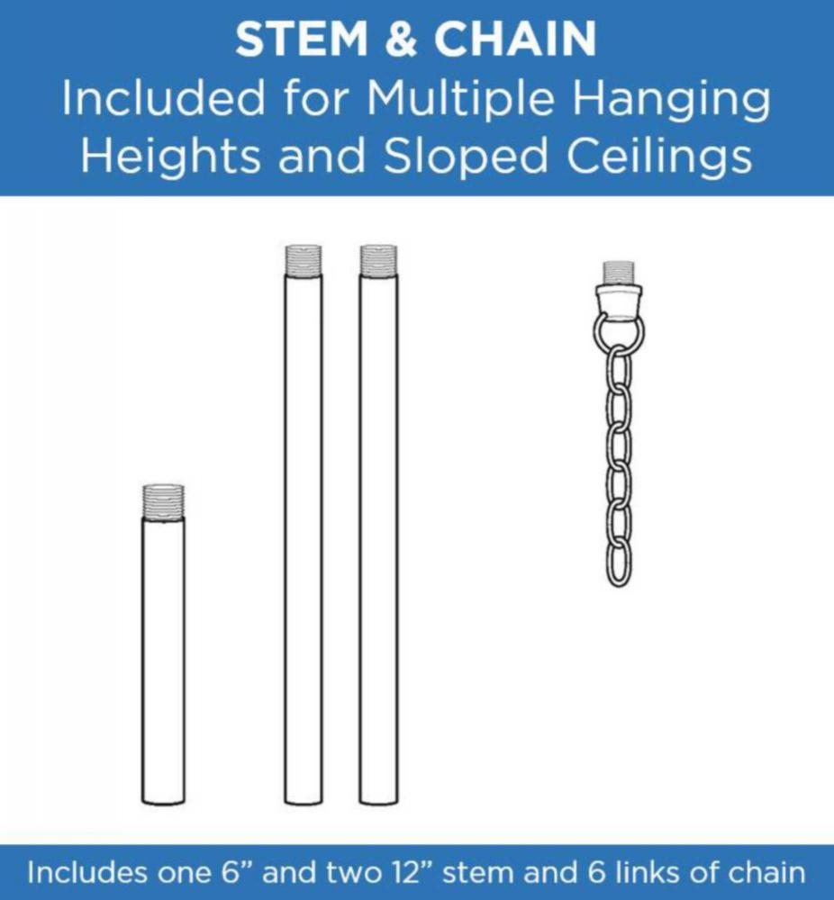 Includes (2) 12" and (1) 6" stems and 3 links of chain to customize the hanging height to your space