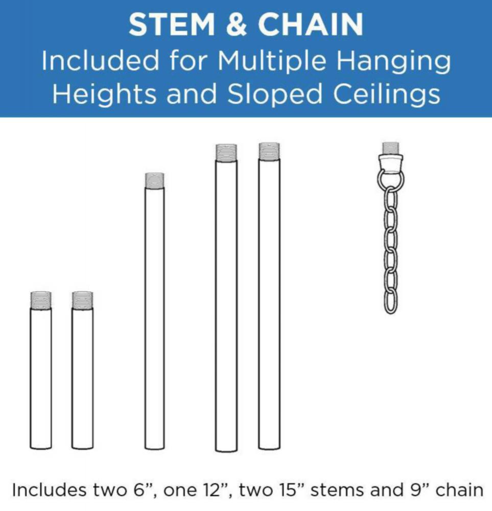 Painted Venetian Bronze finish.;Clear double prismatic glass creates a heavenly glow.;Finely crafted strap and knob details.;Includes two 6", one 12", two 15" stems and 6 links of chain.