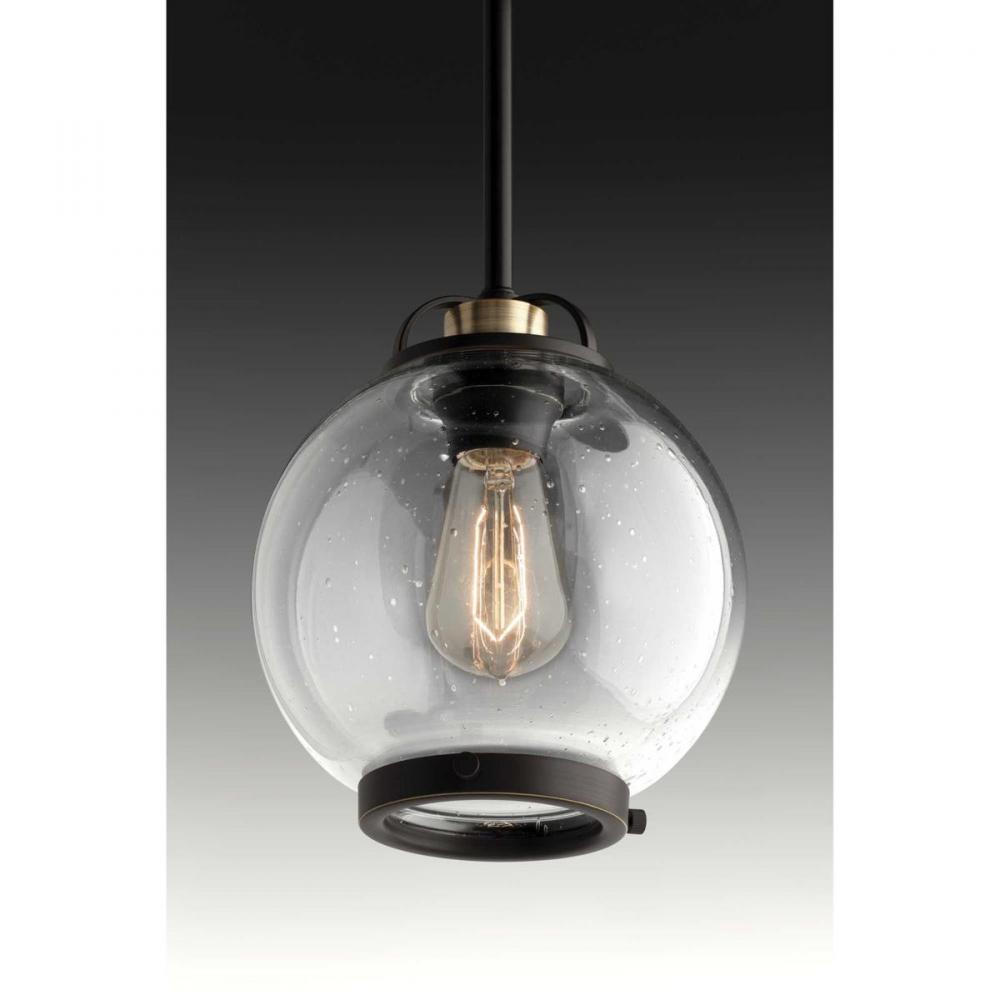 Chronicle one-light mini-pendants add visual interest and are ideal for commercial-style home kitchens or vintage dining areas. A metal trim accent ring adds a finishing touch the spherical glass globe. Clear seeded glass with an Antique Bronze frame.