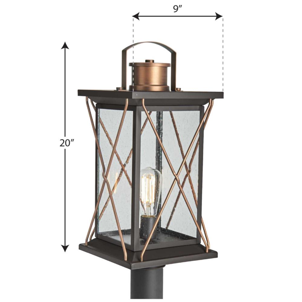 Transform your home into a warm and cozy dream with the friendly farmhouse-style of this post lantern. A rustic X-brace design decorates each side of the charming lantern silhouette. Clear seeded glass panes add an extra pop of rustic personality. An antique bronze finish complemented with antique copper accents adds warmth and character as the lantern infuses your home with gentle illumination.