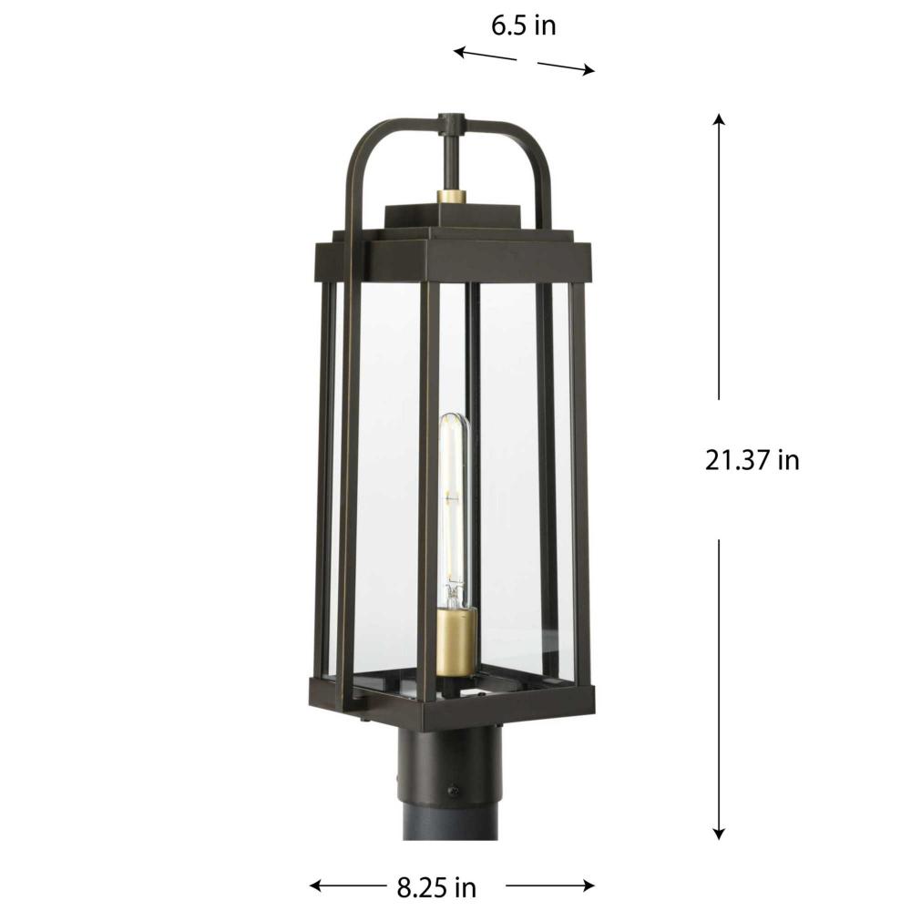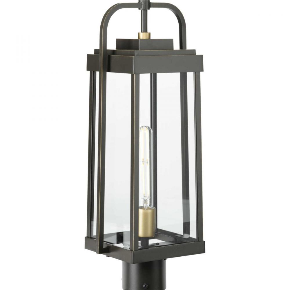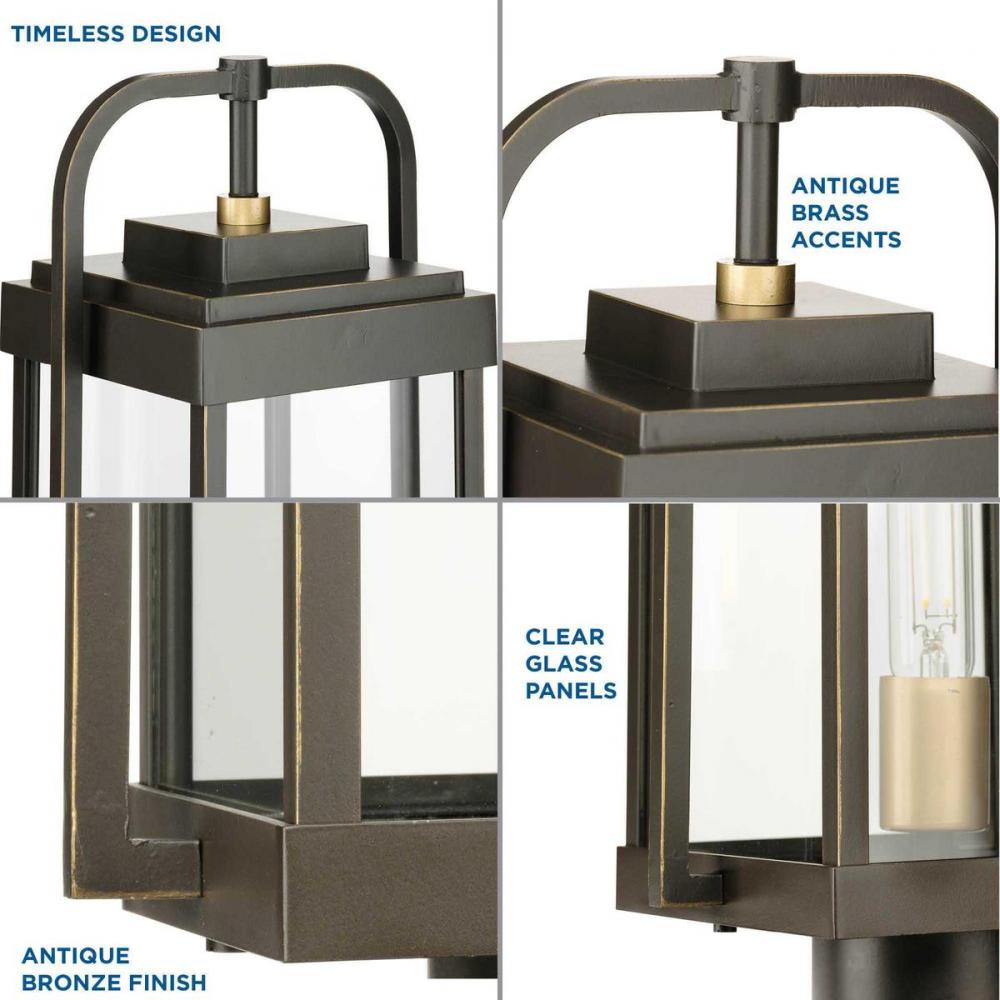Combine a stately elegance with modern style with the Walcott Collection. The post lantern's elongated frame holds clear glass panels. The frame is coated in a handsome antique bronze finish punctuated with brass-tone accents to add vintage charm.