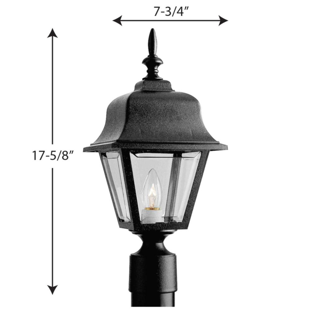 Black finish.;Clear beveled acrylic panels.;Non-metallic.;Post lantern requires one 100-watt incandescent bulb;UL listed for safety