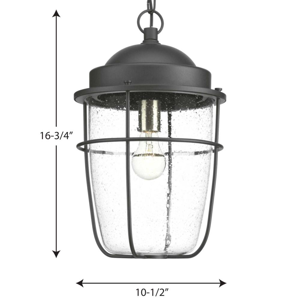 A nautical-inspired collection;Ideal for a variety of exteriors, including Coastal, Transitional and Urban Industrial settings;Textured Black finish with clear seeded glass feature a hint of brushed nickel on the interior;Hanging lantern uses one 100 watt