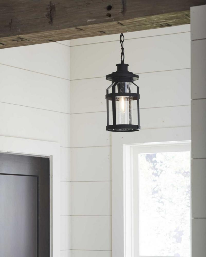 The one-light hanging lantern in the Haslett Collection features a design with intersecting linear details that surrounds clear seeded glass and finished in Black. Coastal-inspired frame is suitable to complement architecture with Farmhouse flair.