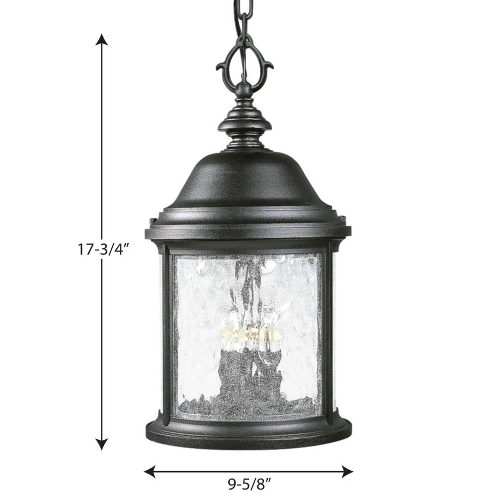 Inspired by lanterns from the Old World, the Ashmore collection incorporates handsome details, quill-scrolled arms and decorative finials. The water seeded glass is in a die-cast aluminum frame. The three-light hanging lantern. Textured Black finish.