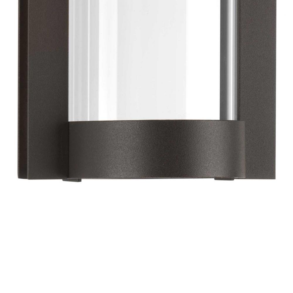 A modern outdoor LED sconce.;LED source provides energy efficient source with low maintenance and cost savings benefits;Features an architectural-inspired open linear frame and clear glass diffuser;Finished in Antique Bronze;623 lumens 69.2 lumens/watt per