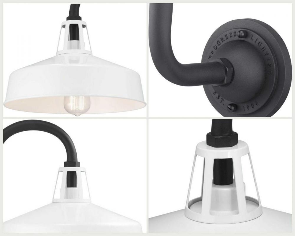 A black gooseneck arm gives a burst of personality to this traditional metal warehouse shade;The large wall lantern can be mounted indoors or outdoors;A fun way to perk up a space when hung on either side of a front or rear door, by a garage, or in rec roo