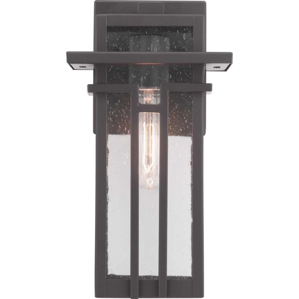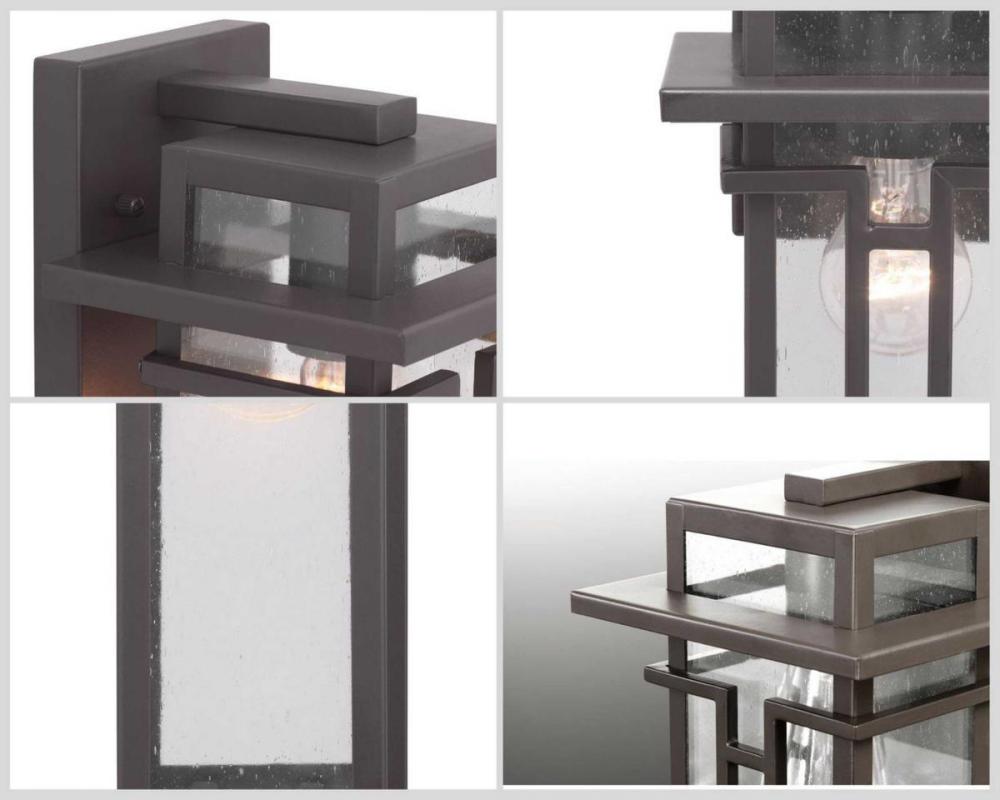 Geometric details in Boxwood’s design enhance Craftsman-inspired architecture. The one-light small wall lantern features clear seeded glass and finished in Antique Bronze which completes the authentic style.