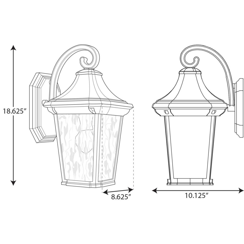 This wall lantern is a go-to choice when incorporating classic silhouettes with a farmhouse flair into your home décor vision. The traditional frame is constructed with non-metallic, corrosion-resistant composite polymer in a classic black finish. A beautiful water glass shade adds charming character to the timeless design. DURASHIELD by Progress Lighting is built to last. Constructed from a composite material with UV protection, DURASHIELD holds up even in the harshest weather conditions. This high-performance finish has a 5-year warranty and is resistant to rust, corrosion, and fading.