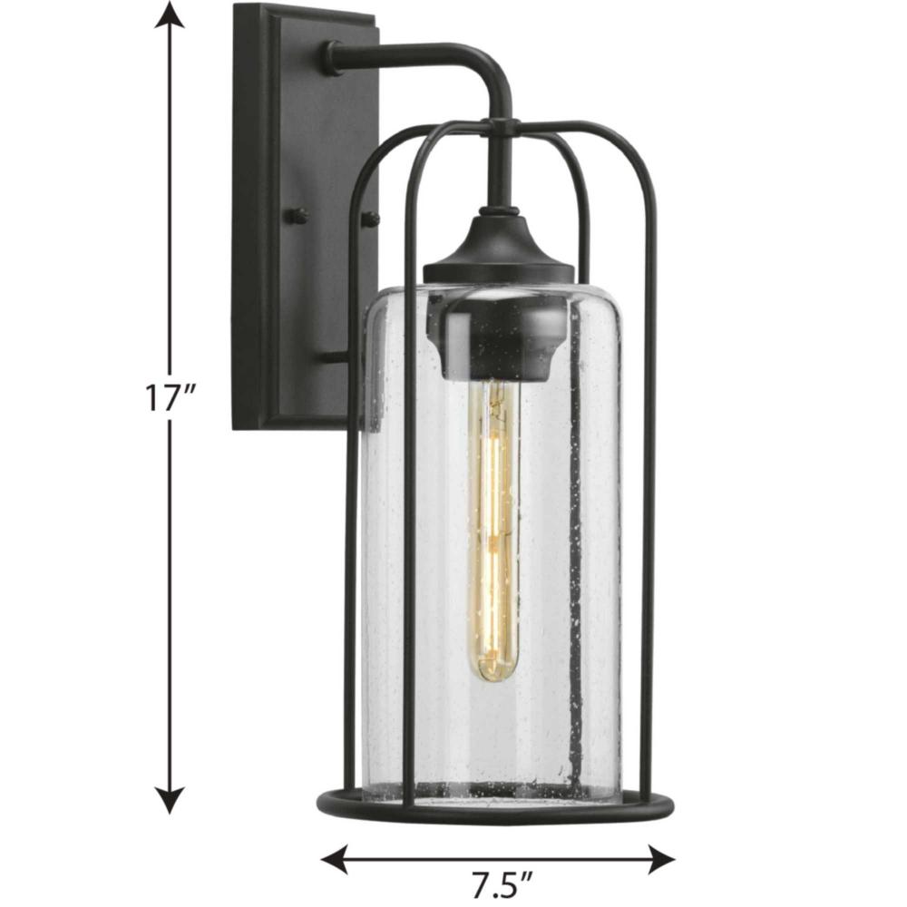 Incorporate a timeless style inspired by Victorian-era gaslight fittings with the Watch Hill Collection 1-Light Textured Black Clear Seeded Glass Farmhouse Outdoor Medium Wall Lantern Light. The elongated cage design highlighted by gracefully curving slender arms is coated in a classic textured black finish. The frame cradles a seeded glass shade that complements a variety of home styles.