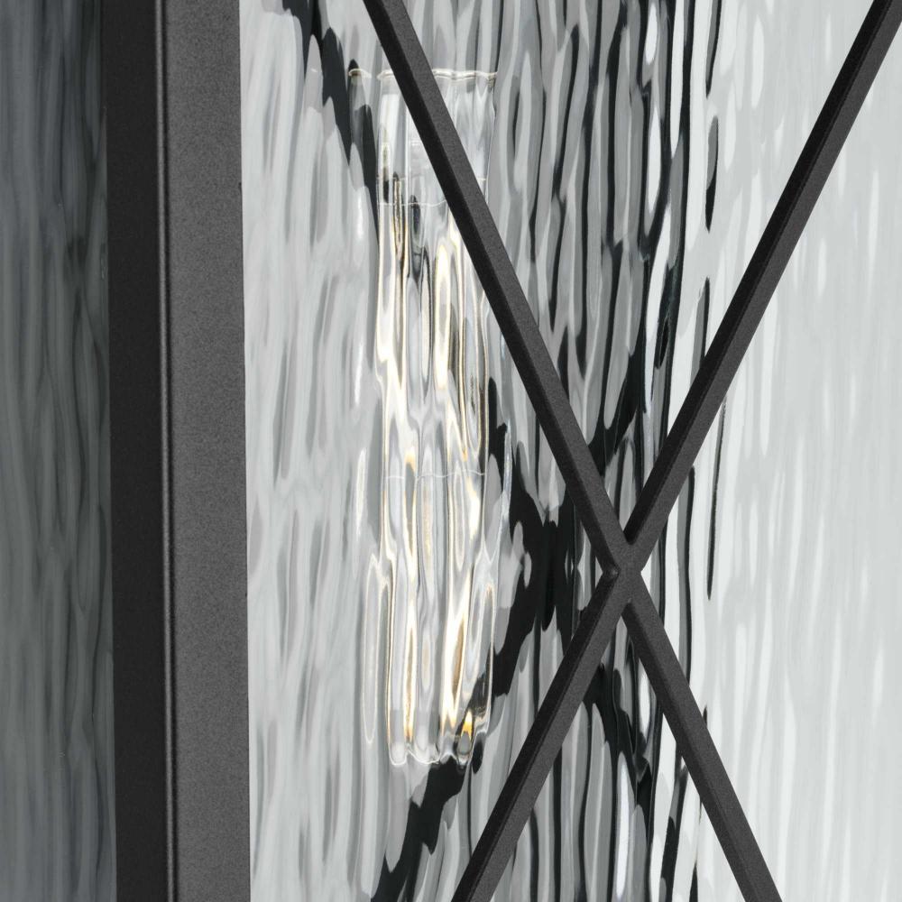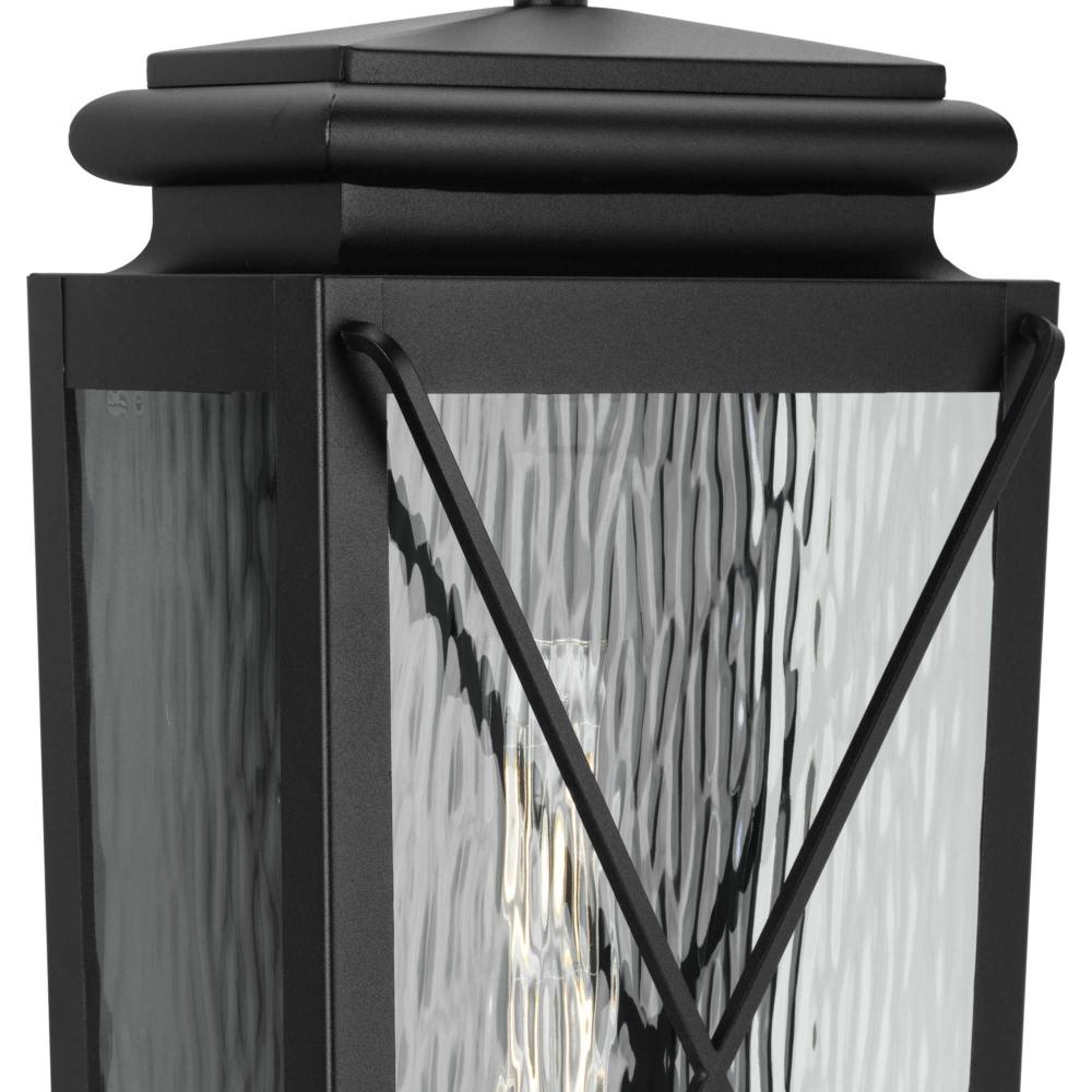 The fixture's sophisticated cross brace design compliments the textured water glass and creates a nostalgic, stately appeal
