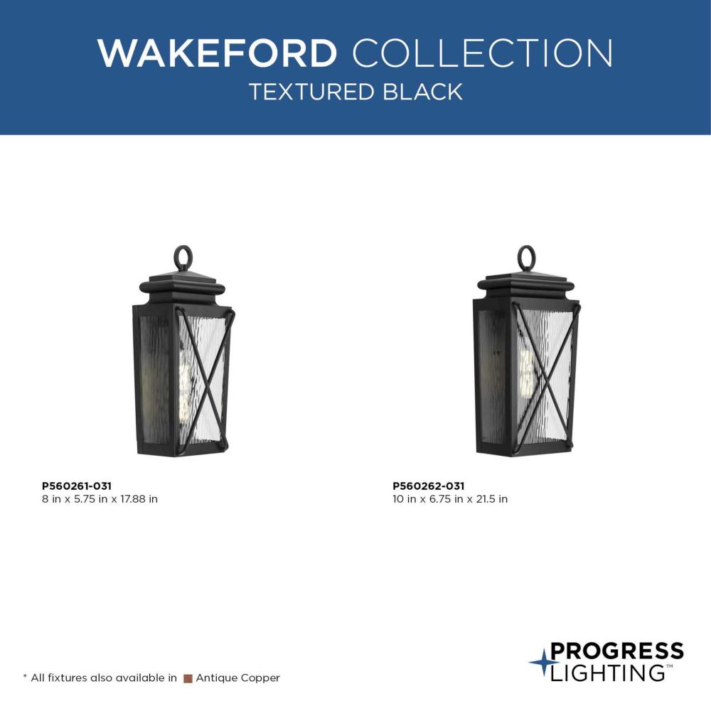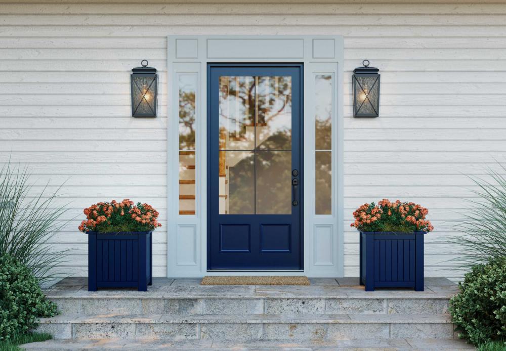 Finished in classic black, water glass and crown molding trim gives Wakeford a nostalgic look with modern sophistication. A cross brace design contrasts against the textured glass panes to offer a vintage look that fits well with both transitional and new traditional exteriors.