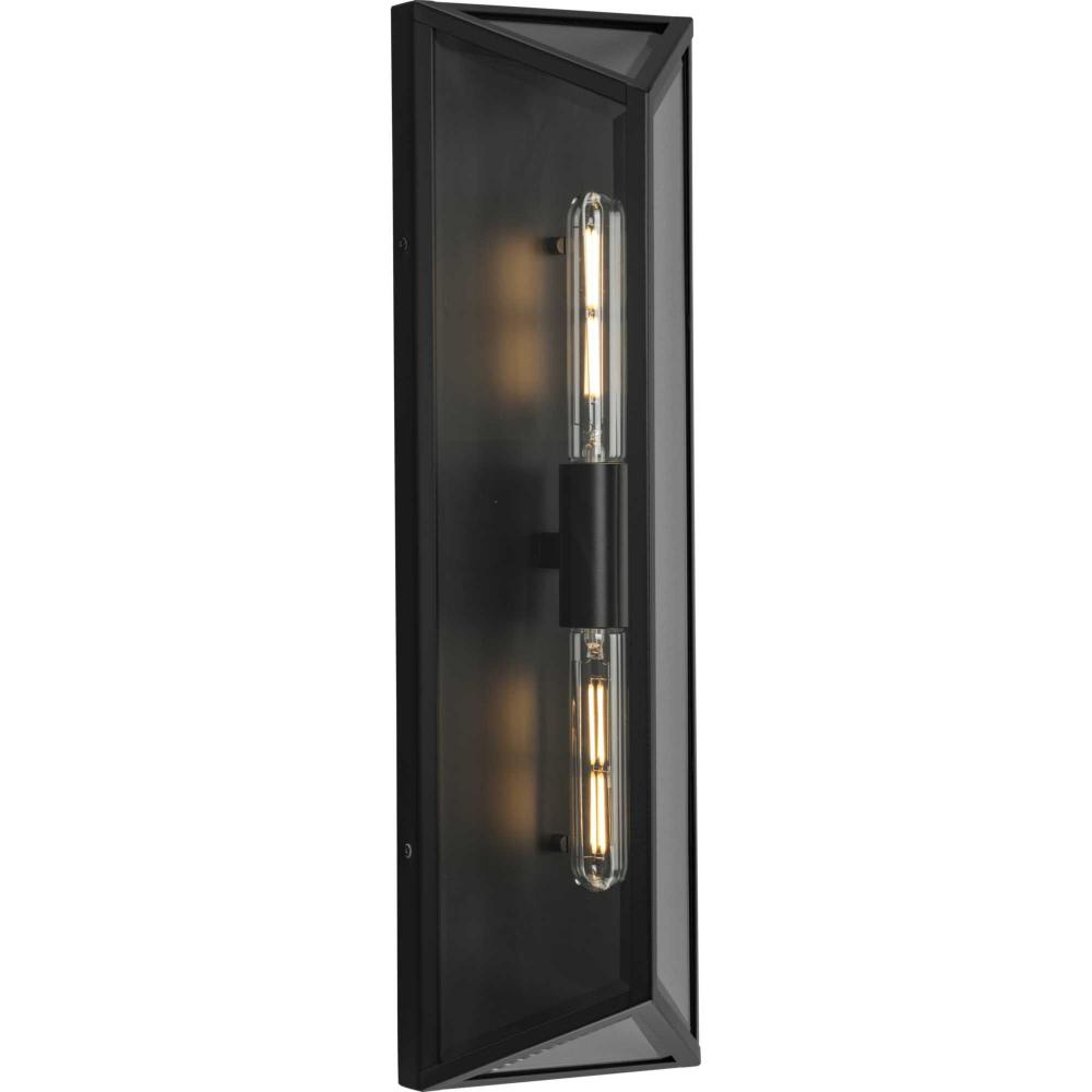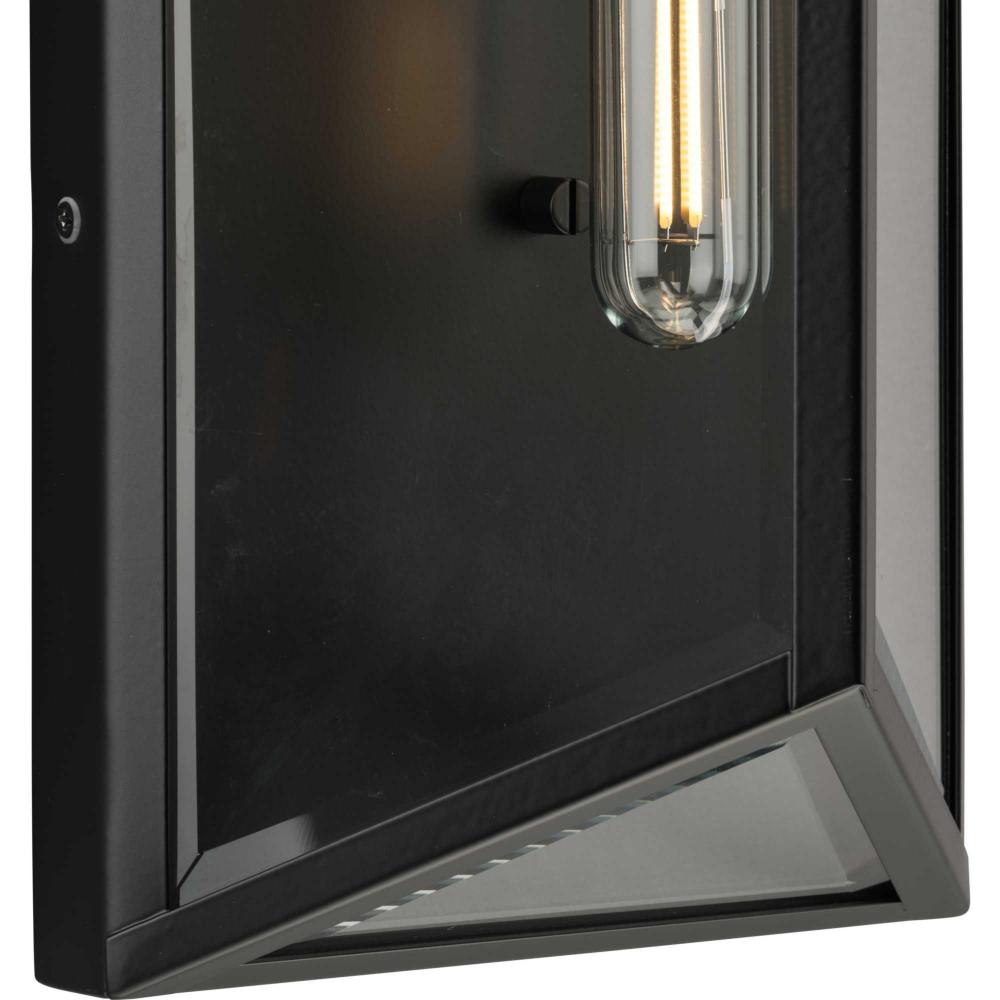 The Bristol Large Outdoor Wall Light is a synthesis of vintage and modern styling. The geometric design is composed of angular clear glass elements that perfectly frame the vertical lights.Its unique frame is finished in crisp matte black. A soft glow emanates from clear beveled glass panels.