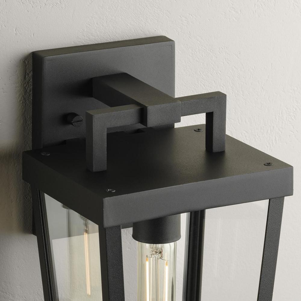 The Tryon Outdoor Wall Lantern features an elongated, tapered geometric frame finished in classic black that exudes refined simplicity. A sleek, squared arch connects the minimalist frame to the backplate while clear glass panels beautifully showcase a sin